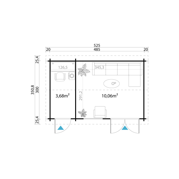 Ulkoseinämitat: 485 x 300 cm.