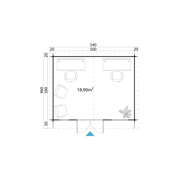 Välismõõdud: 500 x 390 cm. Seina kõrgused 239 cm ja 211 cm.