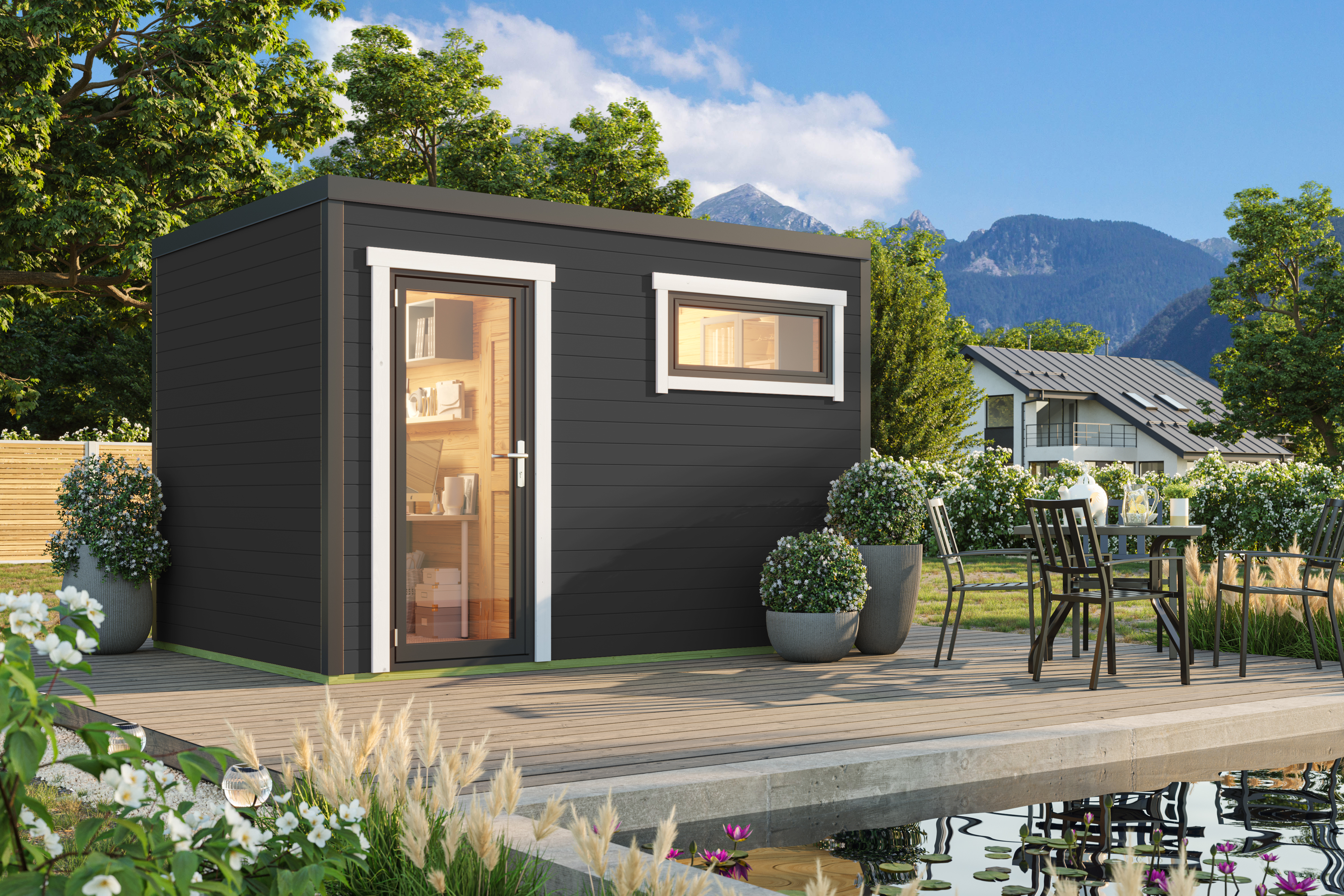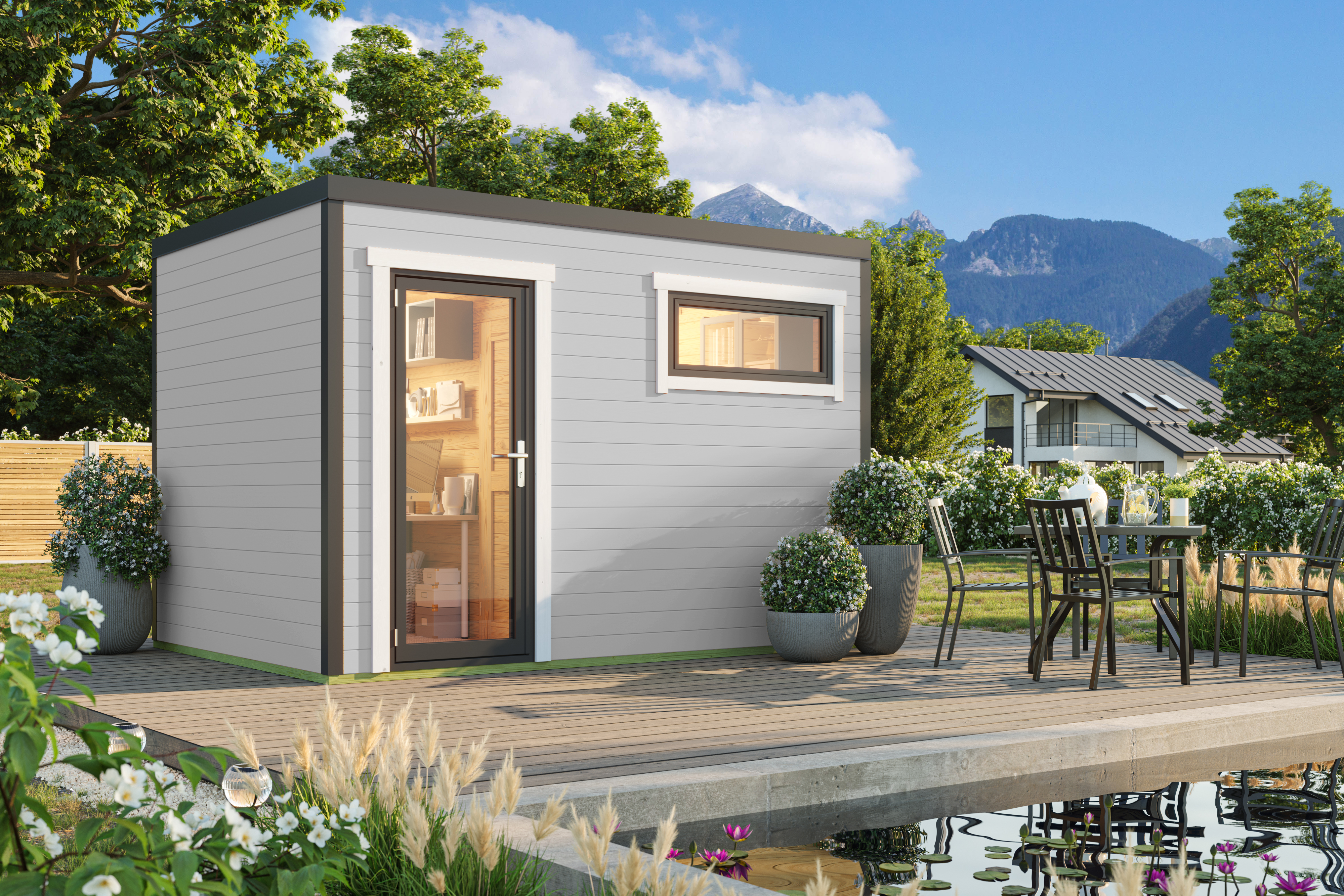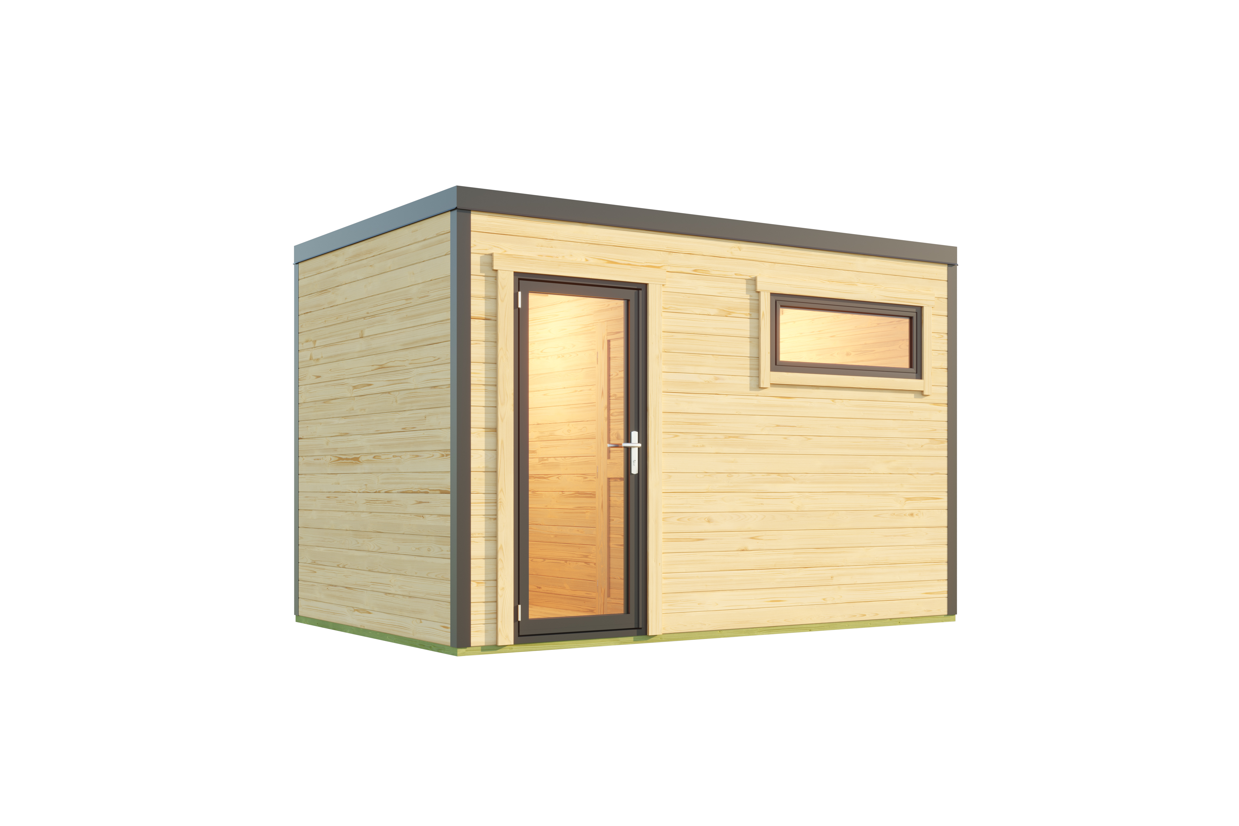 Sardiinia on oma välimuselt kaasaegne tänu kruvinurk-ühendusele ja sulandub paremini ridaelamute kui ka modernete majade kõrvale. Komplektis alusraam, põrand, seinad, uks ja aken, katuselauad ja kinnitusvahendid. Katusekate on võimalik juurde soetada.