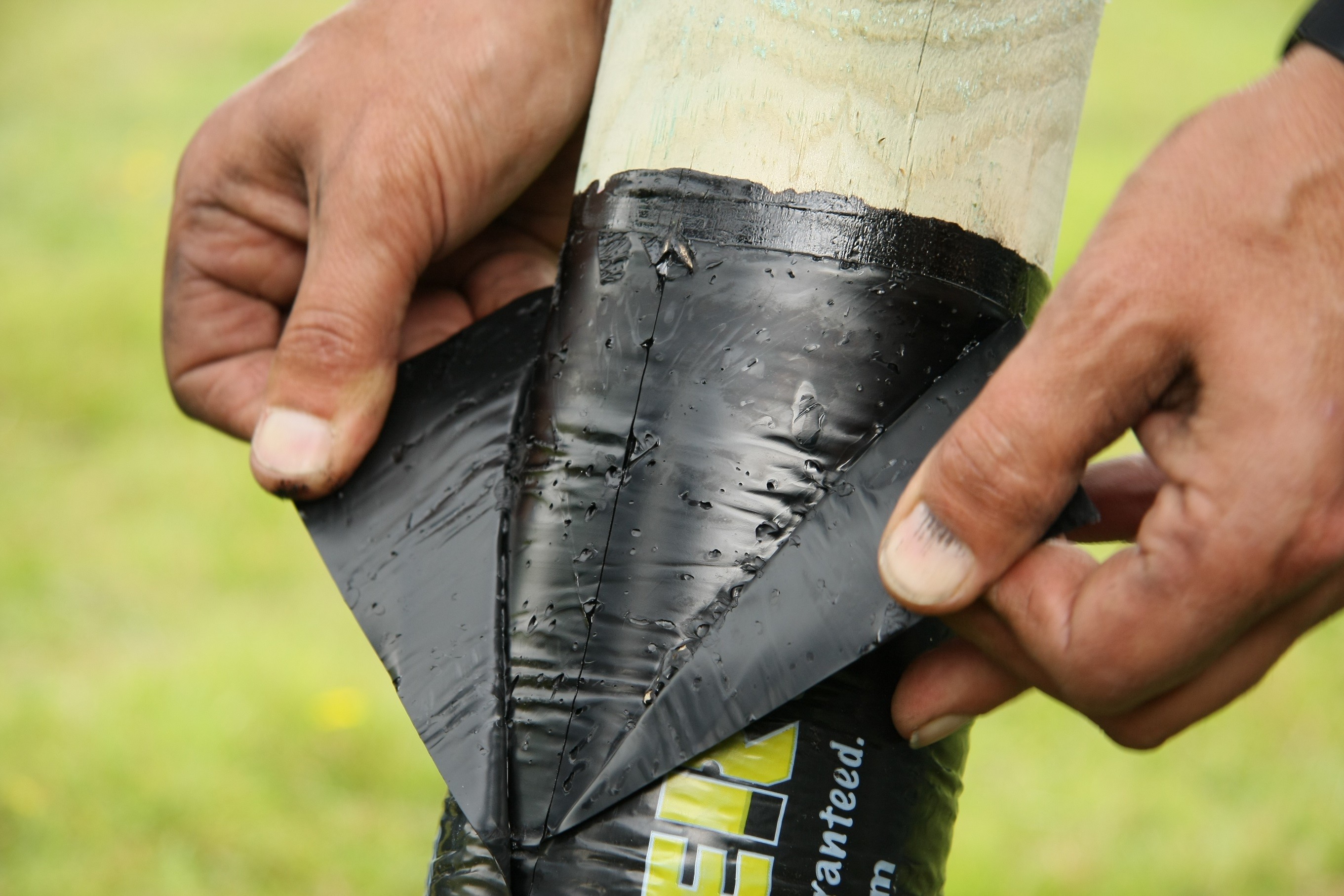 Alumisele otsale on kuumutatud bituumenist kaitsevarrukas, mis hoiab puidukaitsevahendi posti sees ja lagundajad eemal ning kaitseb aiaposte mädanemise eest.