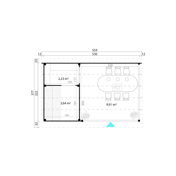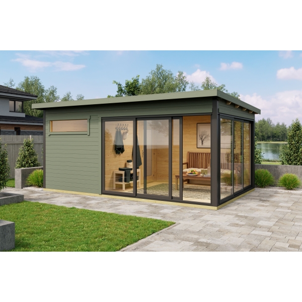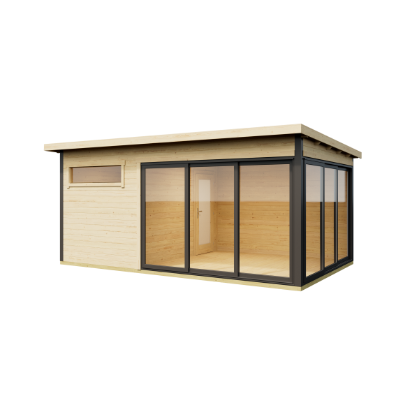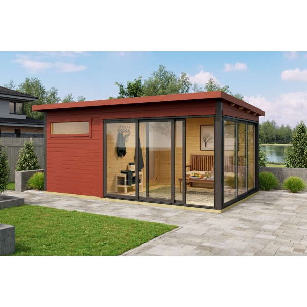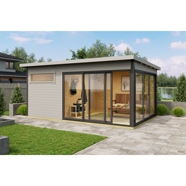 - alumiiniumraamiga pakettklaasiga liuguksed 2041 x 2026 mm ja 3039 x 2026 mm, puust klaasitud siseuks 835 x 1900 mm, karastatud klaasiga leiliruumi uks