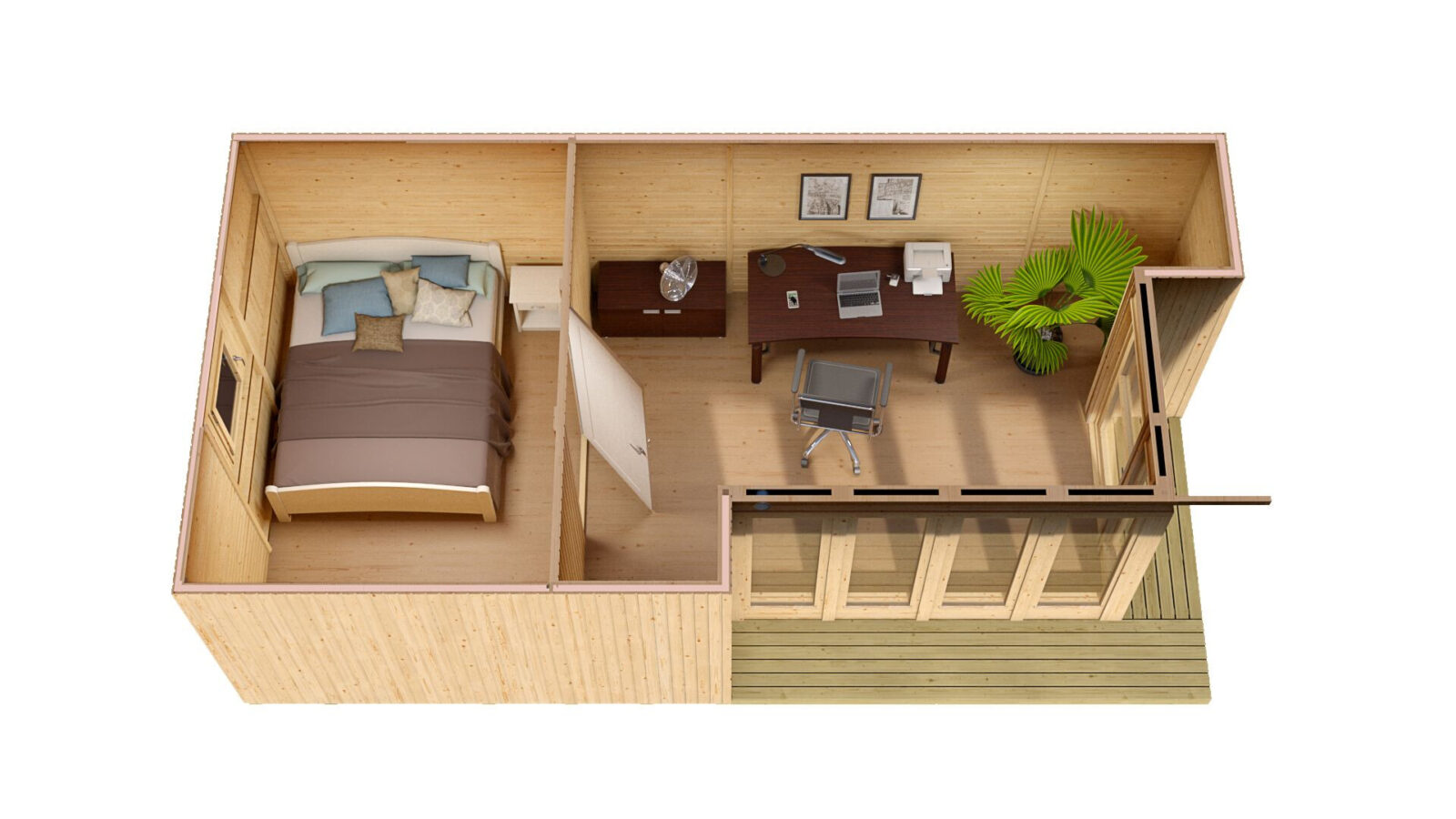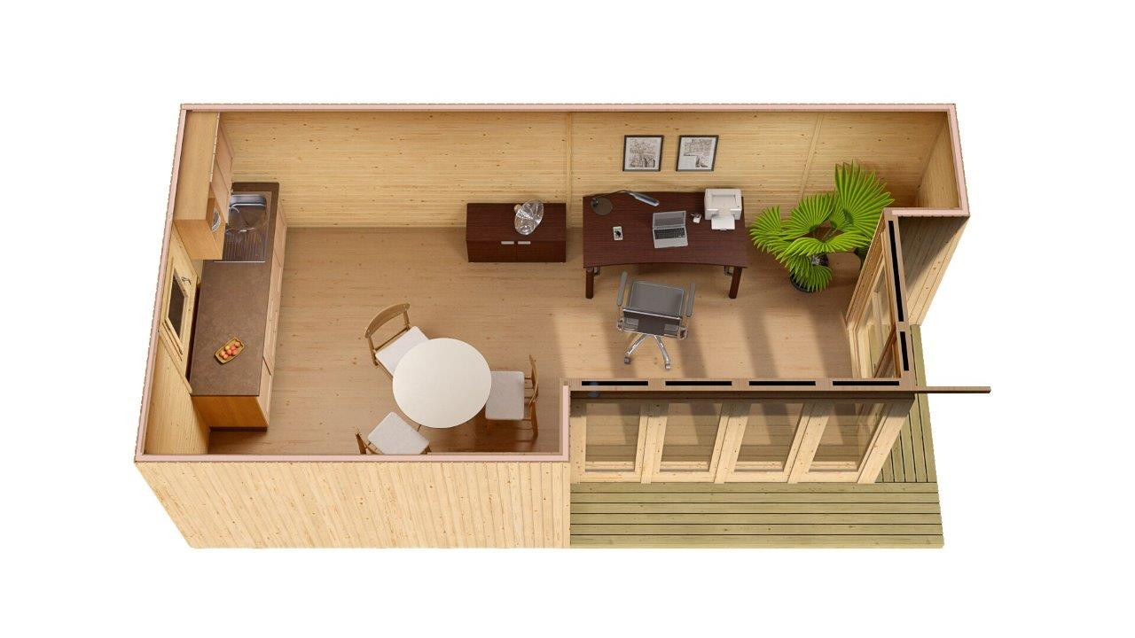 Valmiskilpidest põranda, seinte ja katusega kontor koju või ettevõttesse. Välisvoodrilaud 19mm. Puidust avatäited pakettklaasiga. Katusekate ei sisaldu hinnas.