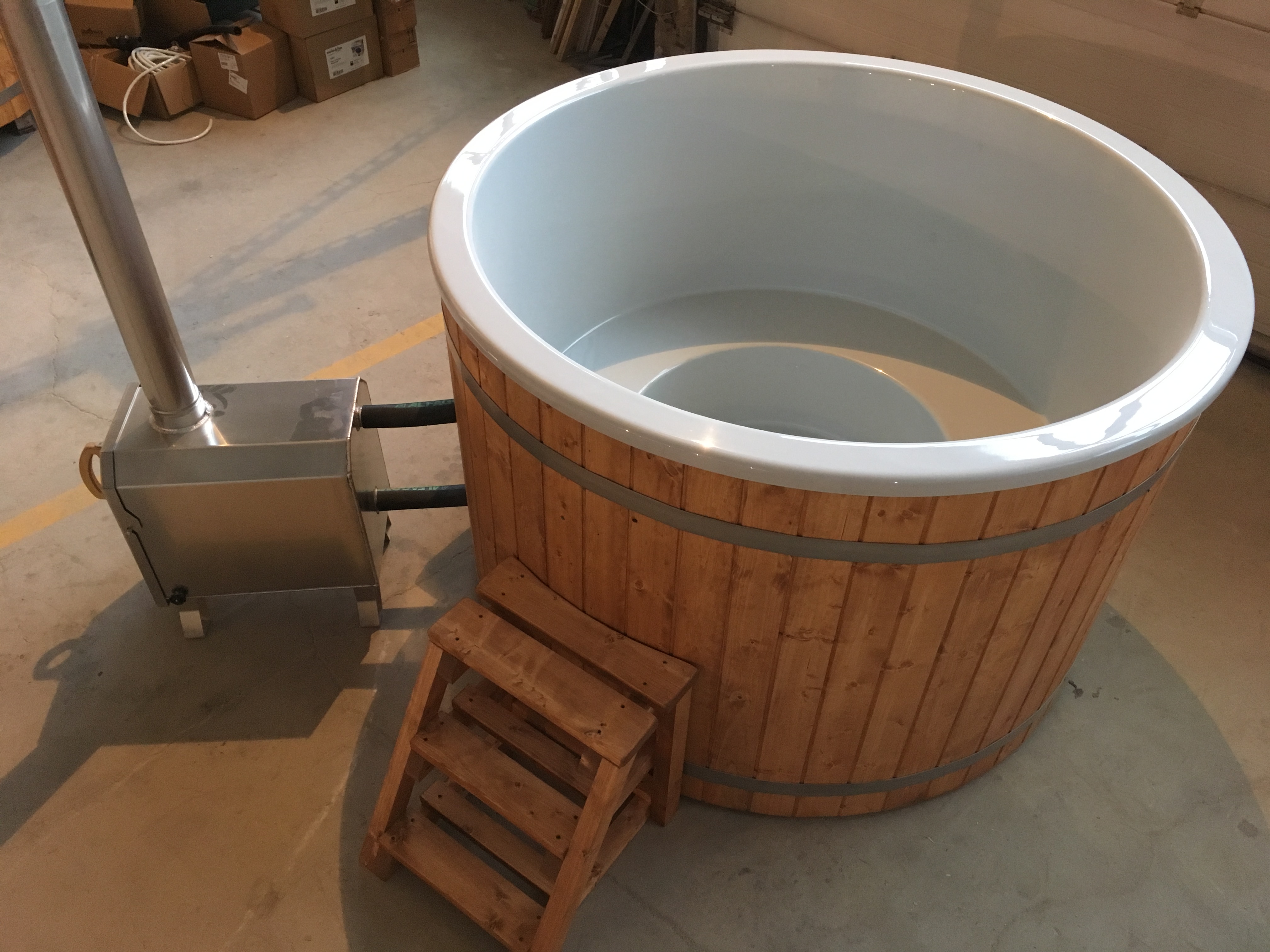 Hinnas sisalduvad klaasplastist sisu, puidust ümbris, viimistlemine väljast puiduõliga, põhjatalad, 2 roostevabast terasest vitsa, merealumiiniumist välisahi 2m korstnaga, äravool kraaniga ja trepp.