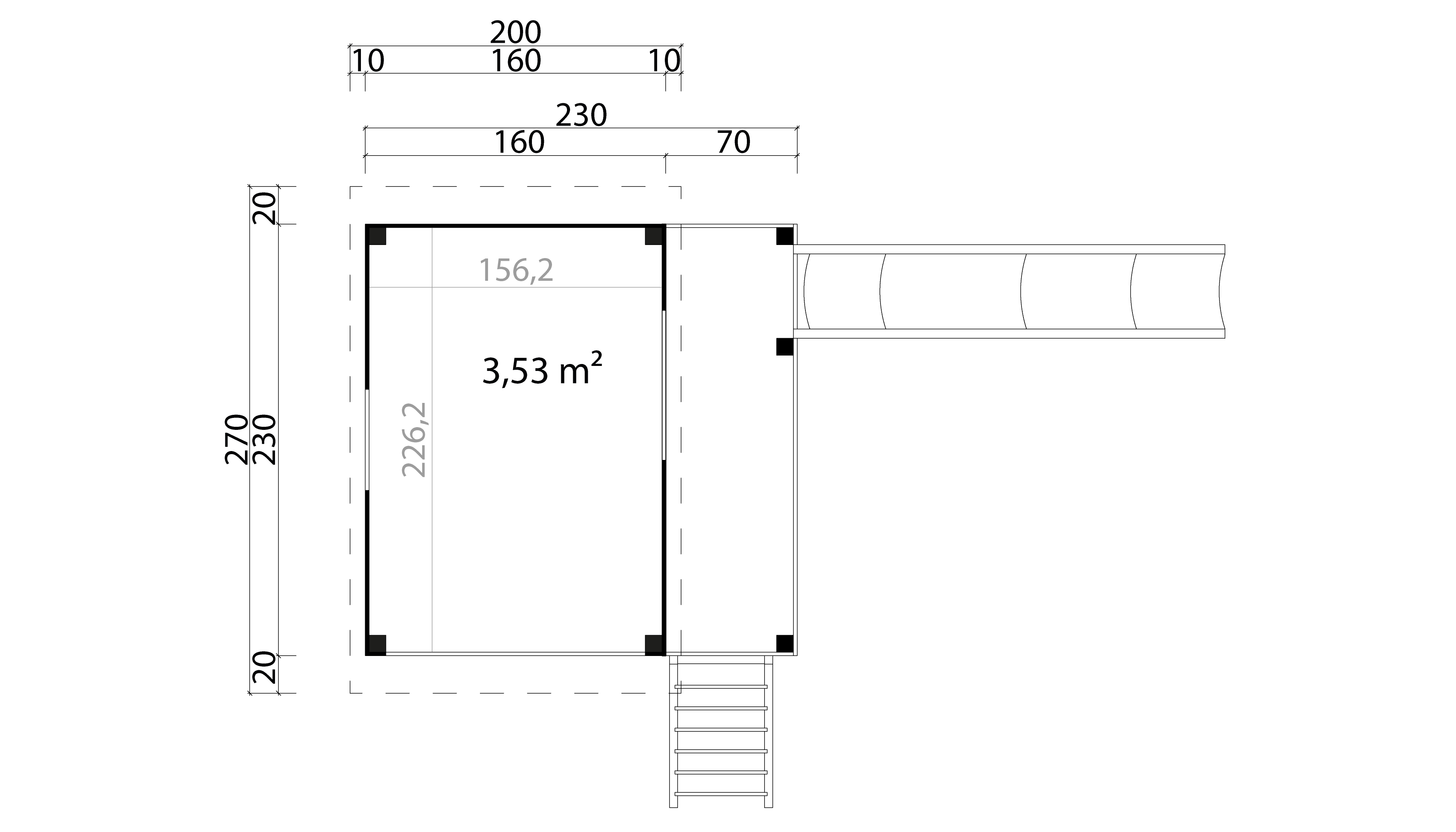 Seina kõrgused 160 cm ja 194 cm. Ümmargune akna ava ja ukse ava(ust ja akent ei ole). Kinniste seinade laud 19 mm(viimistlemata). Trepp.