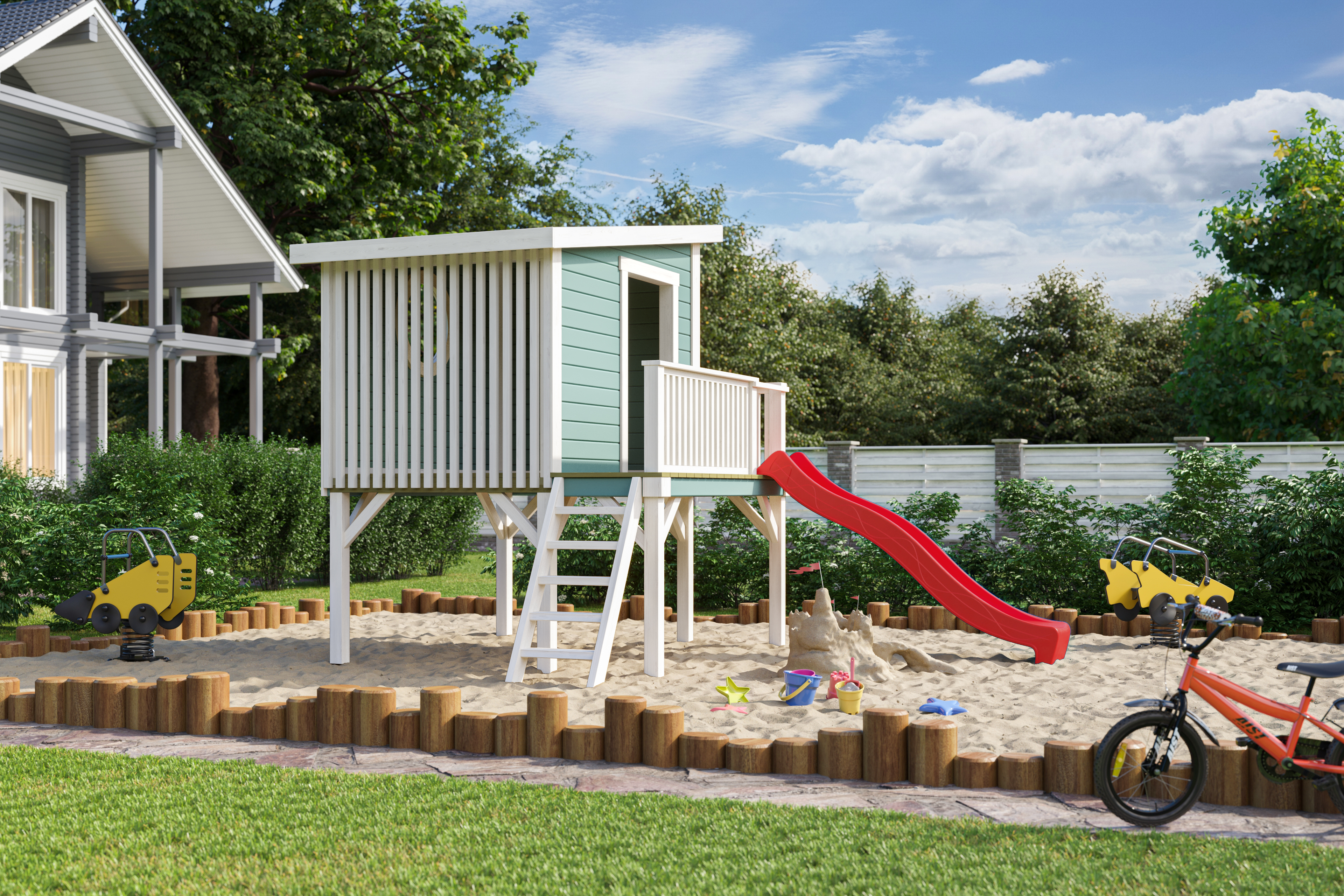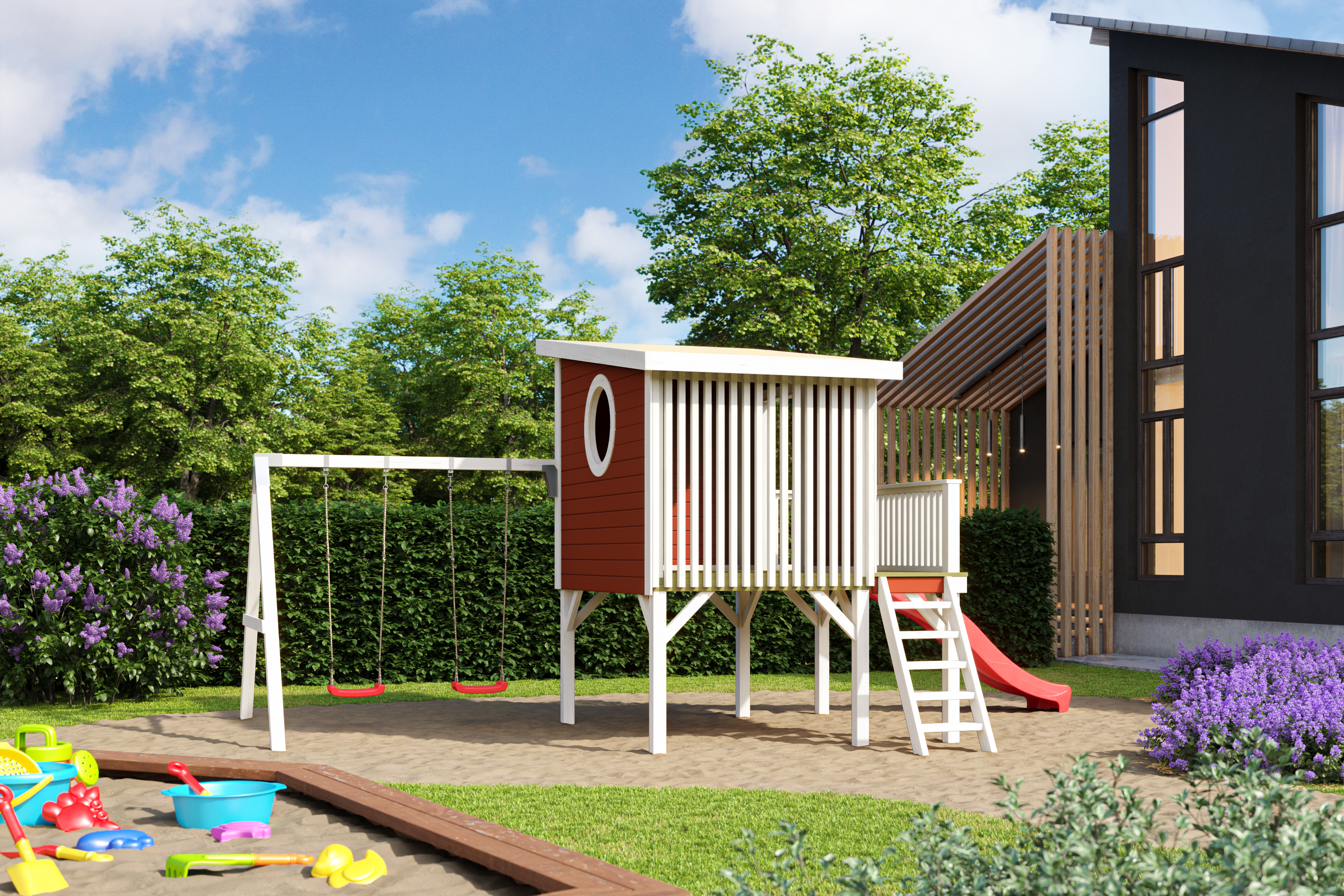 Mängumaja põhjamõõtudega 2,3 x 2,3 m ja 1 võreseinaga(võimaldab mugavalt lapsi jälgida), millele saab tellida juurde kiikumisosa 2 punase plastkiigega(+600€). Punane liumägi 2,3m sisaldub hinnas. Liumäe ja trepi asukohad saab saab soovi korral vahetada.