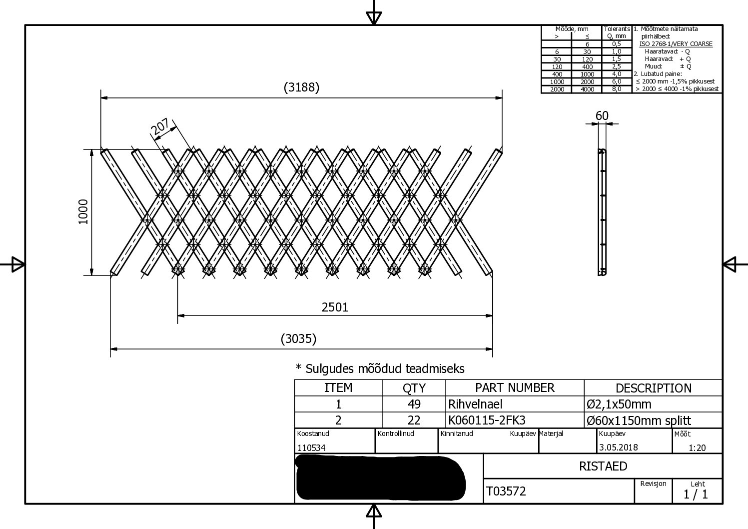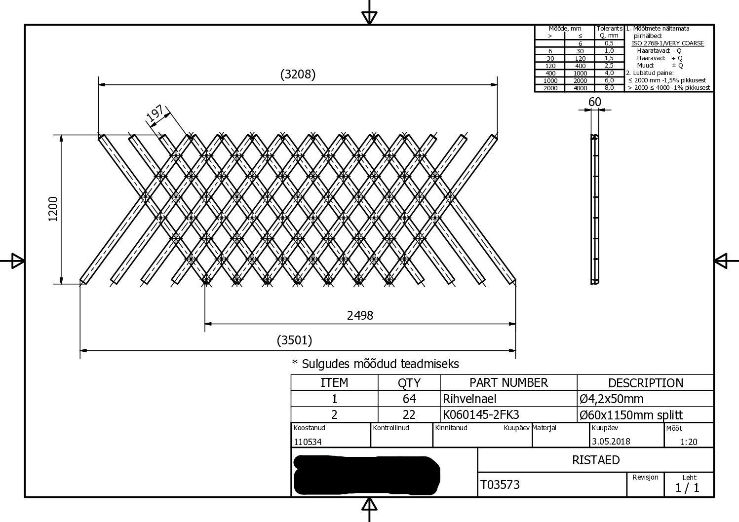 Valmis aiaelemendid (tsingitud naeltega) 2 erineva kõrgusega. Elemendi otsad ei ole püstiselt lõigatud ja latid lähevad järgmise elemendiga kokku.