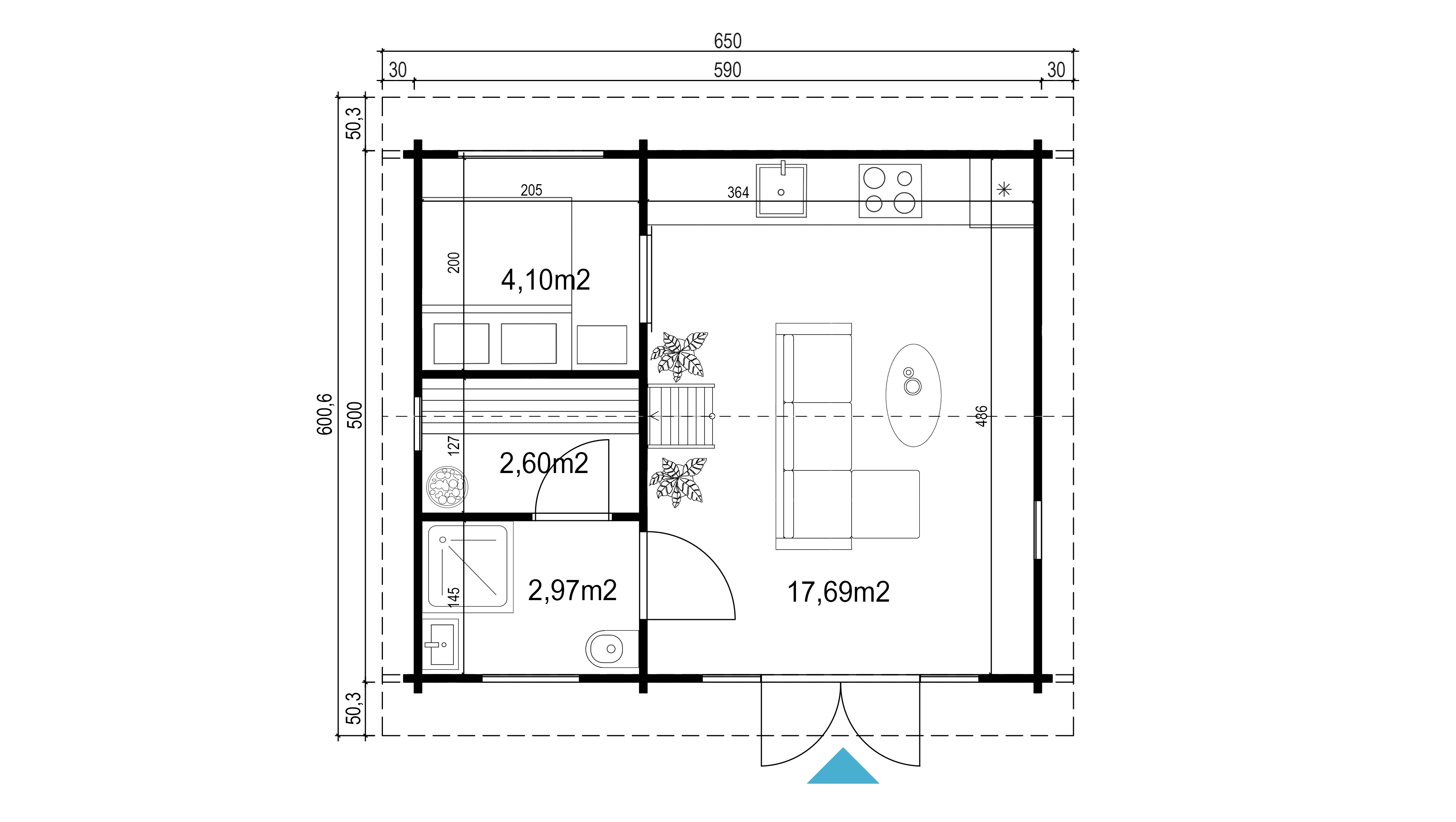 Välismõõdud: 5,9 x 5,0 m. Harja kõrgus 3,74 m, seina kõrgus 2,72 m.