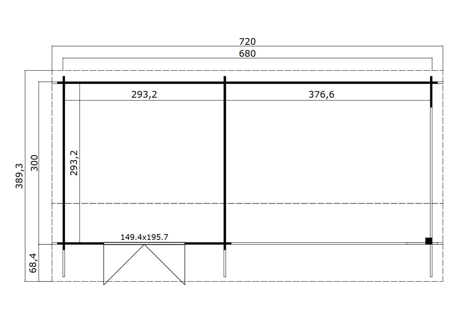 Välismõõdud: 680 x 300 cm. Seina kõrgus 211 cm, harja kõrgus 274 cm.