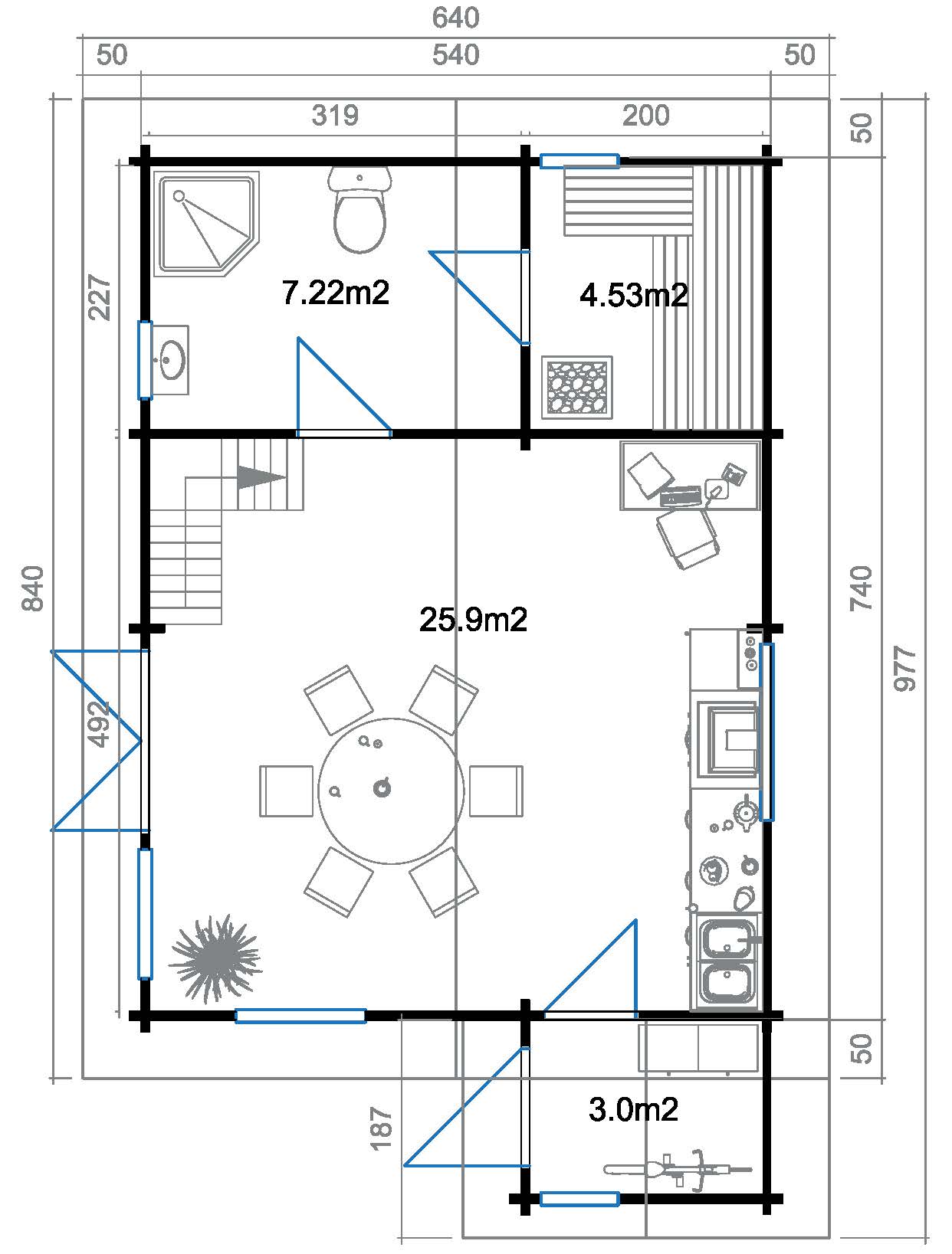 Välismõõdud: 7,4 x 5,4 m. Harja kõrgus 4,9 m.