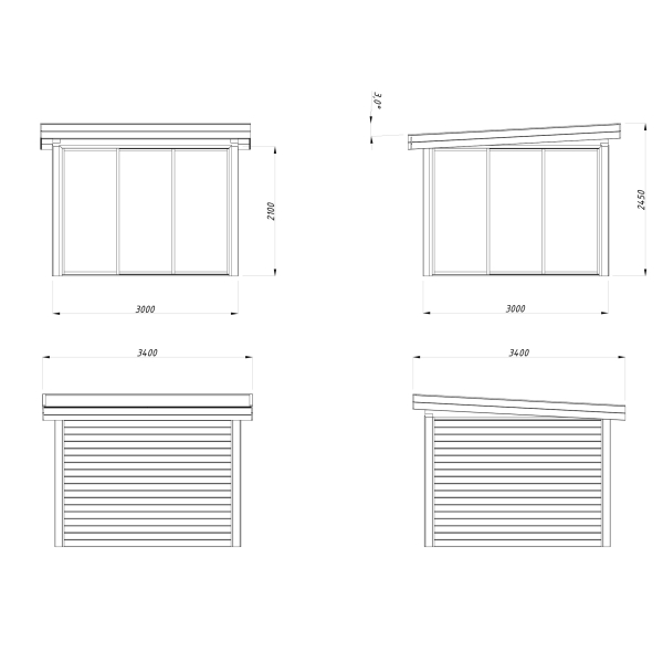 • räystäät 20 cm, katon pinta-ala 12 m² ja kaltevuus 3º