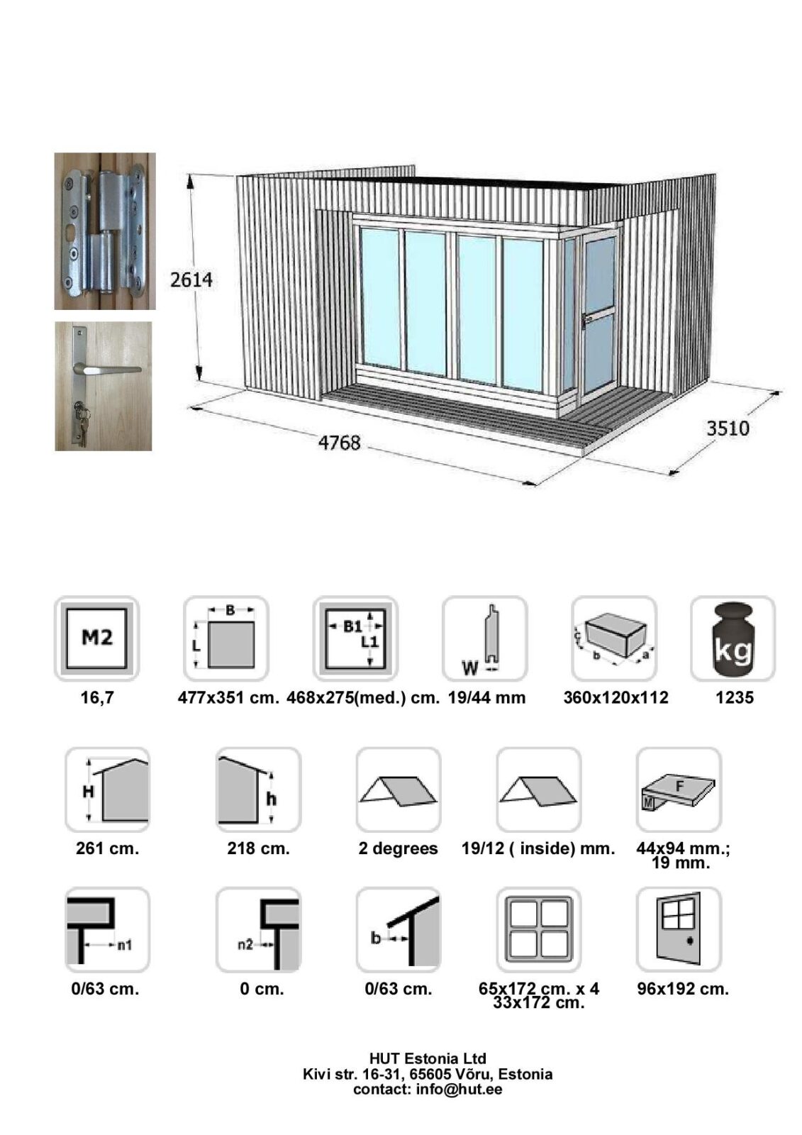 Elementtirakenteiset lattia, seinä ja katto, joita on helppo kasata. Lämpölasit.