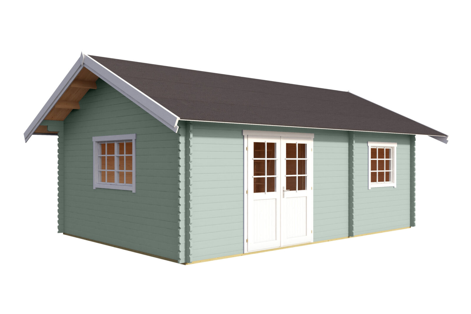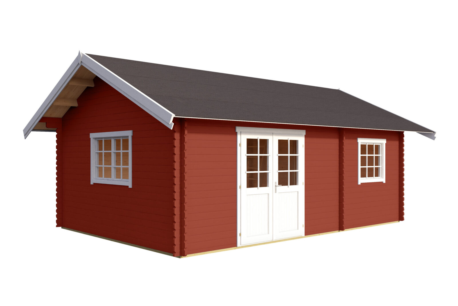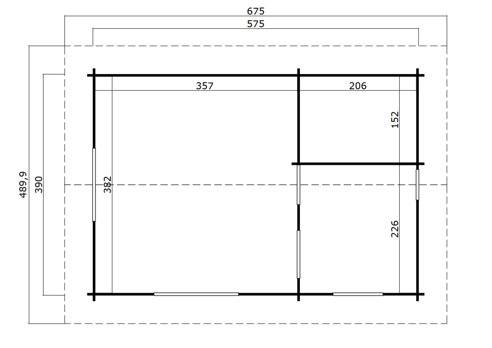 Ulkoseinämitat: 575 x 390 cm. Harjakorkeus 331 cm, seinäkorkeus 234 cm.