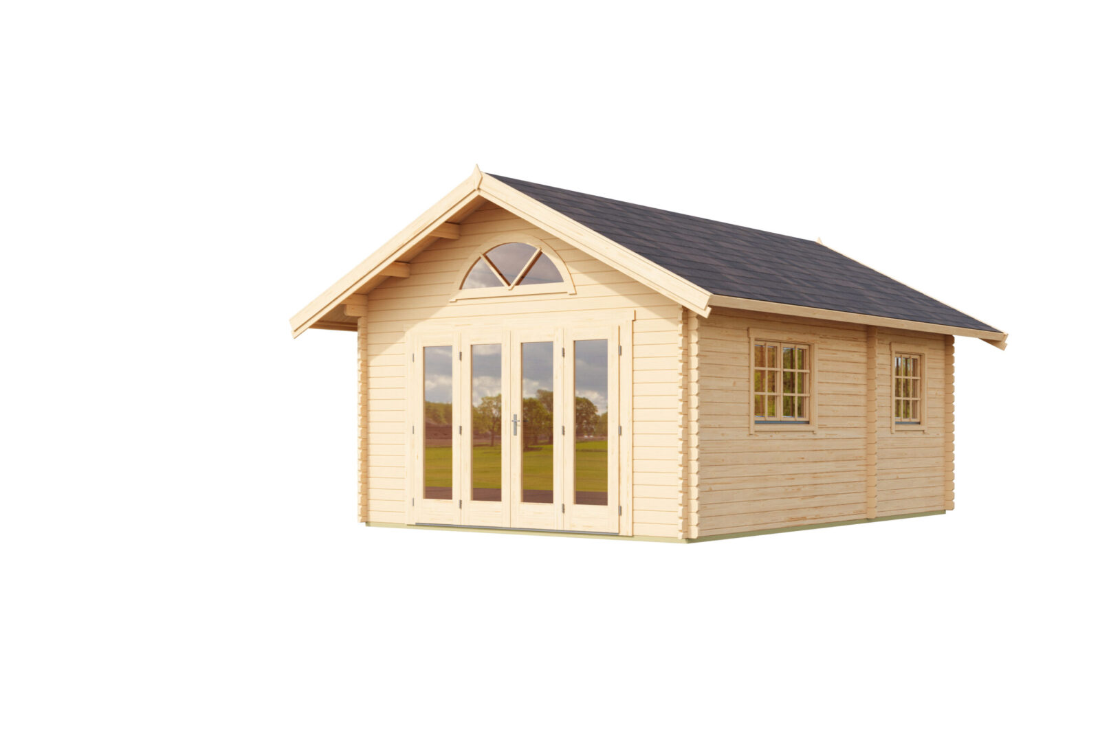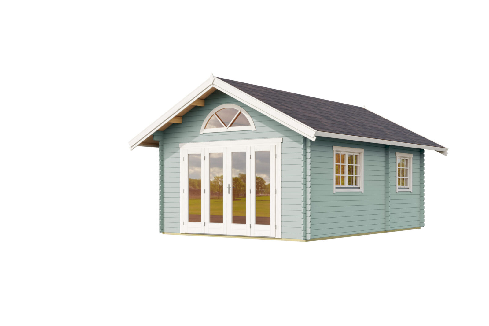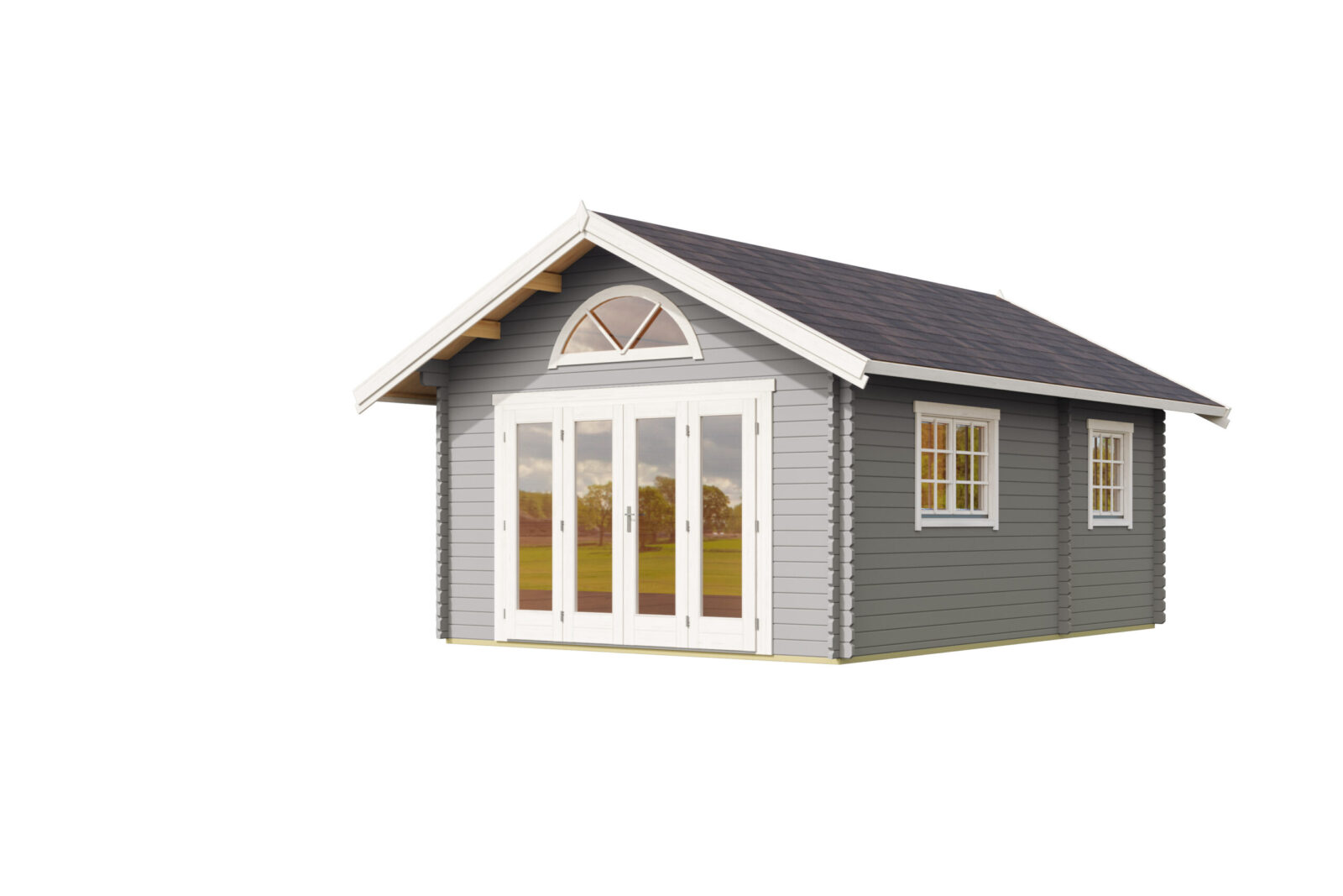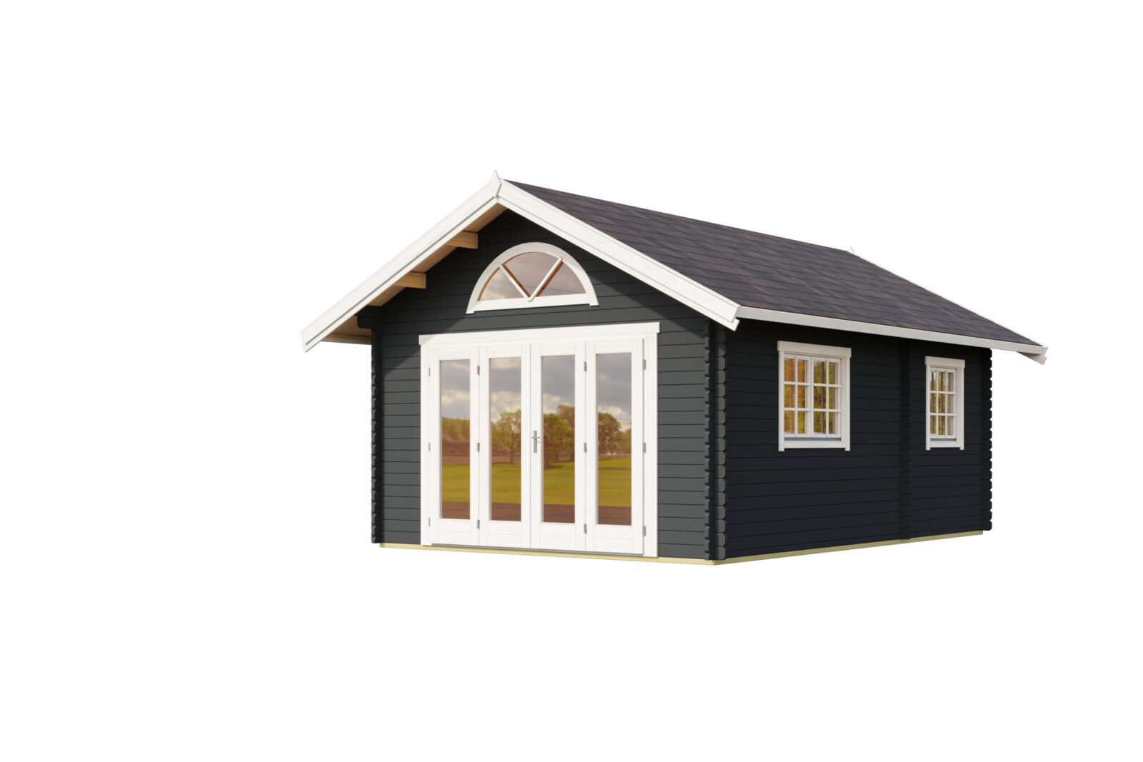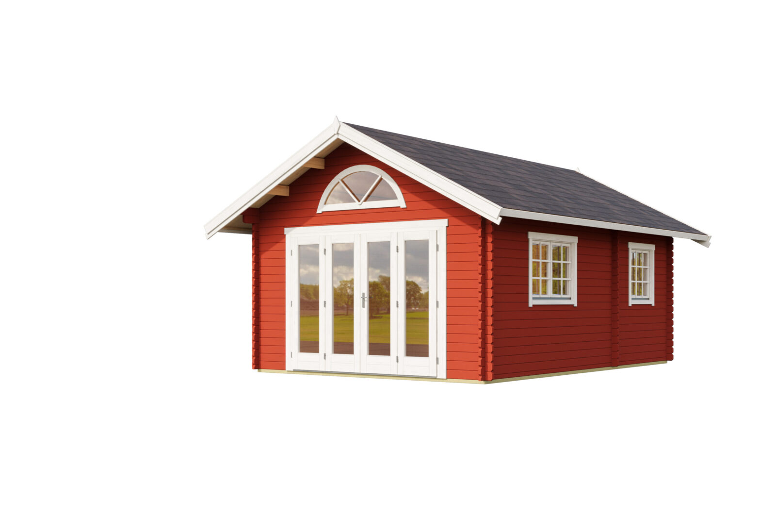 Ulkoseinämitat: 575 x 390 cm. Harjakorkeus 330, seinäkorkeus 240 cm.