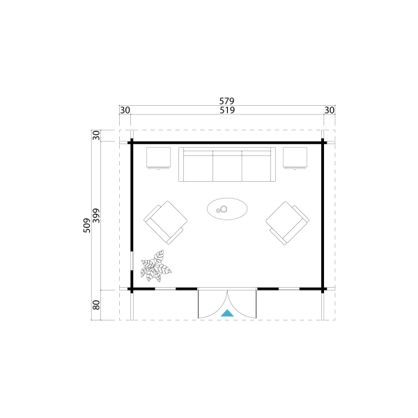 Välismõõdud: 399 x 519 cm. Seina kõrgused 238 ja 211 cm.