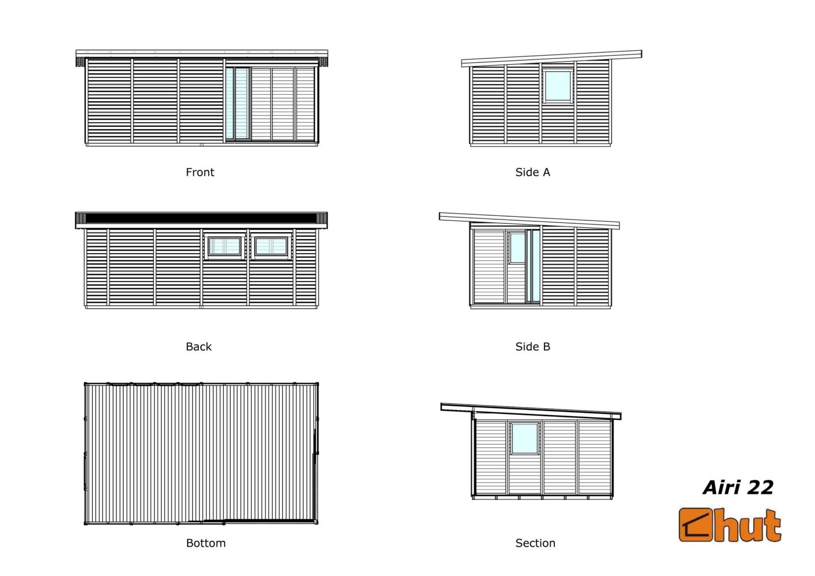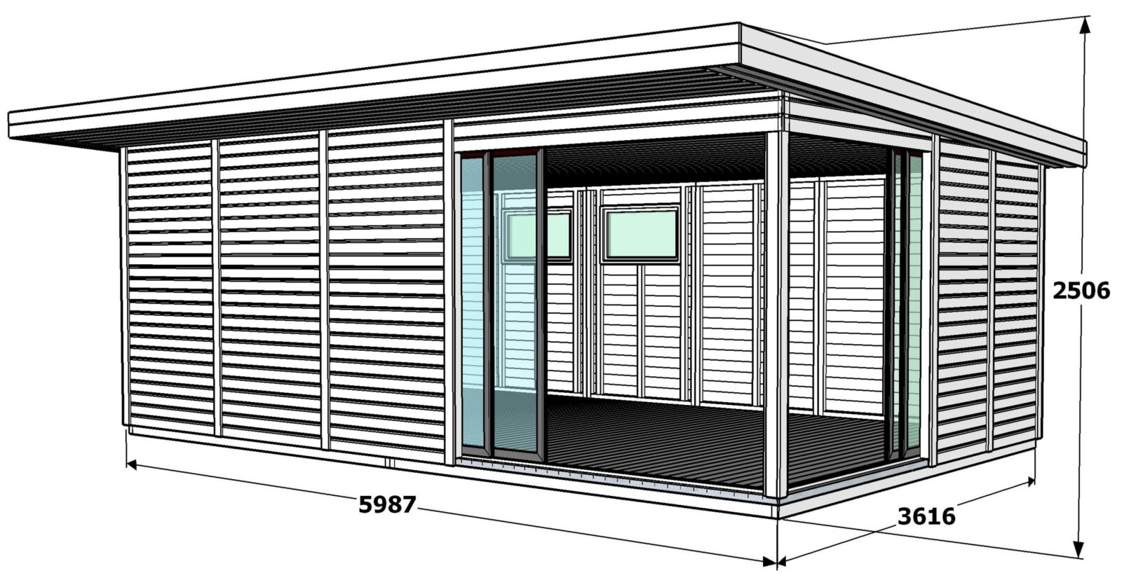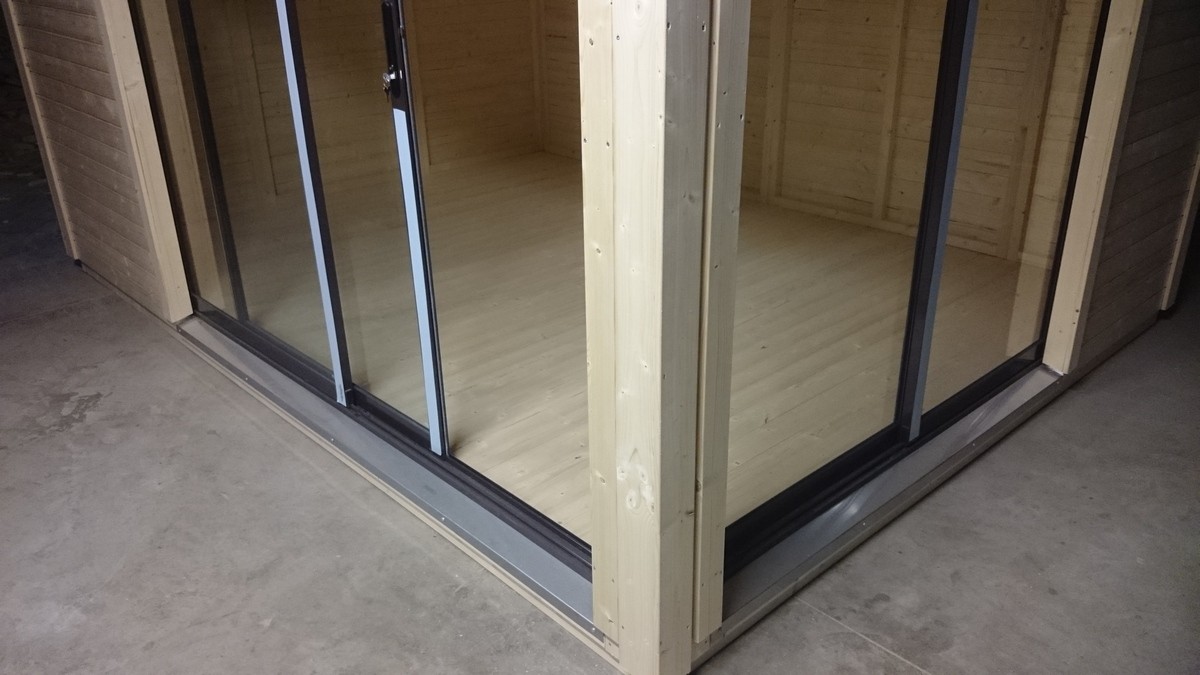 Valmis põranda- ja seinakilpidega ning 2 ilmastikukindla lukustatava alumiiniumist liuguksega(karastatud klaasiga 229×185 cm, 171×185 cm) valgusküllane suvemaja-kodukontor.