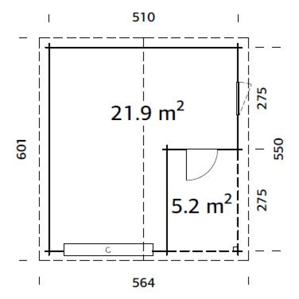 Välismõõdud: 5,1 x 5,5 m. Harja kõrgus 321 cm, seina kõrgus 228 cm.