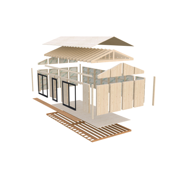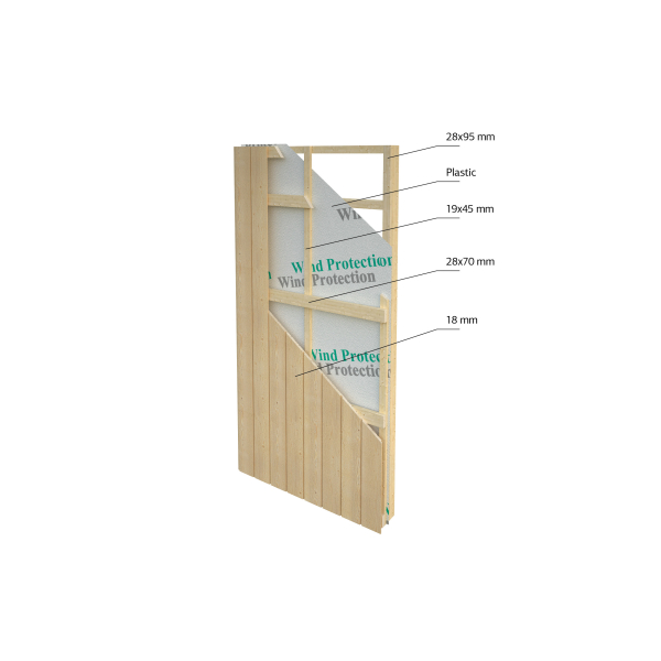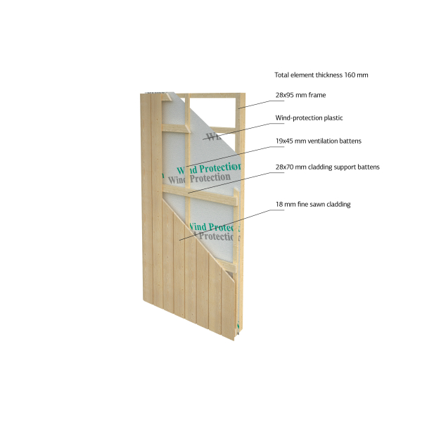 - soojustusvalmis elementseinad kogupaksusega 180 mm (18 mm peensaetud viimistlemata voodrilaud tuuletõkkekilega, 95 mm sõrestik=soojustuse paksus)