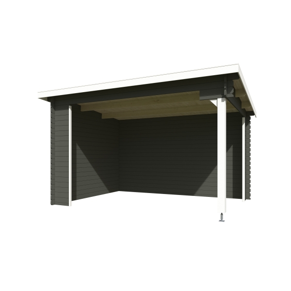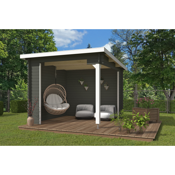Ulkoseinämitat: 380 x 275 cm. Räystäskorkeudet 251 cm ja 222 cm.