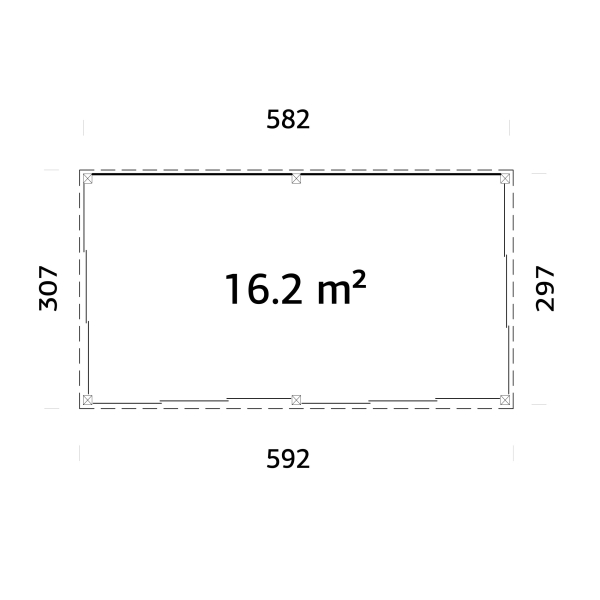 Ulkoseinämitat: 5,8 x 3,0 m. Räystäskorkeus 226 cm, katon korkeus 273 cm.