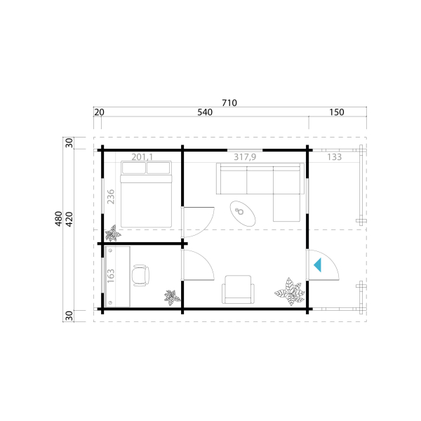 Ulkoseinämitat: 5,4 x 4,2 m + terassi 1,3 x 4,2 m.