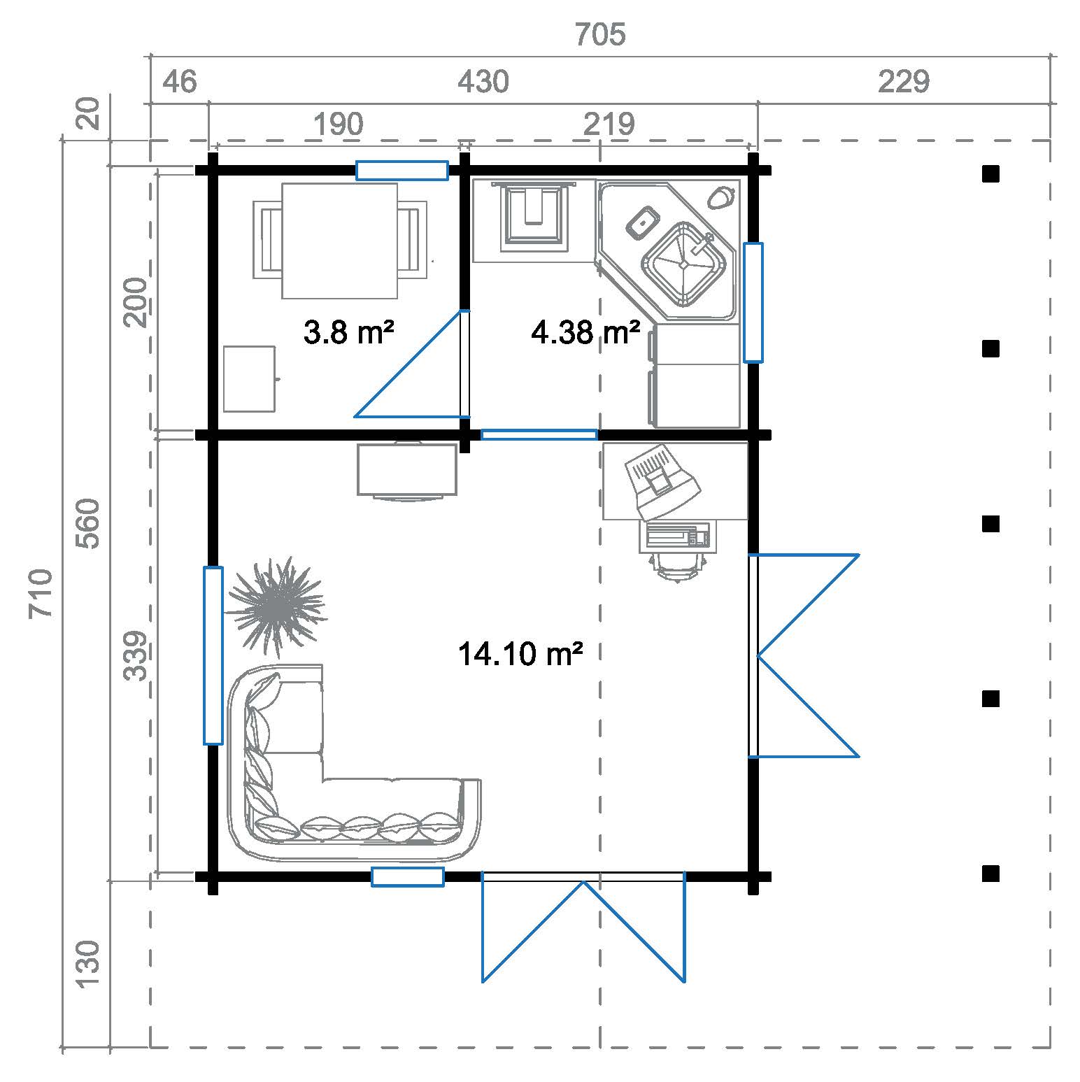 - sisäänavattavat 4/14/4 ikkunat lämpölaseilla ja alumiinitippalistoilla 916 x 916 mm, 552 x 1729 mm, 702 x 1190 mm ja 1374 x 916 mm