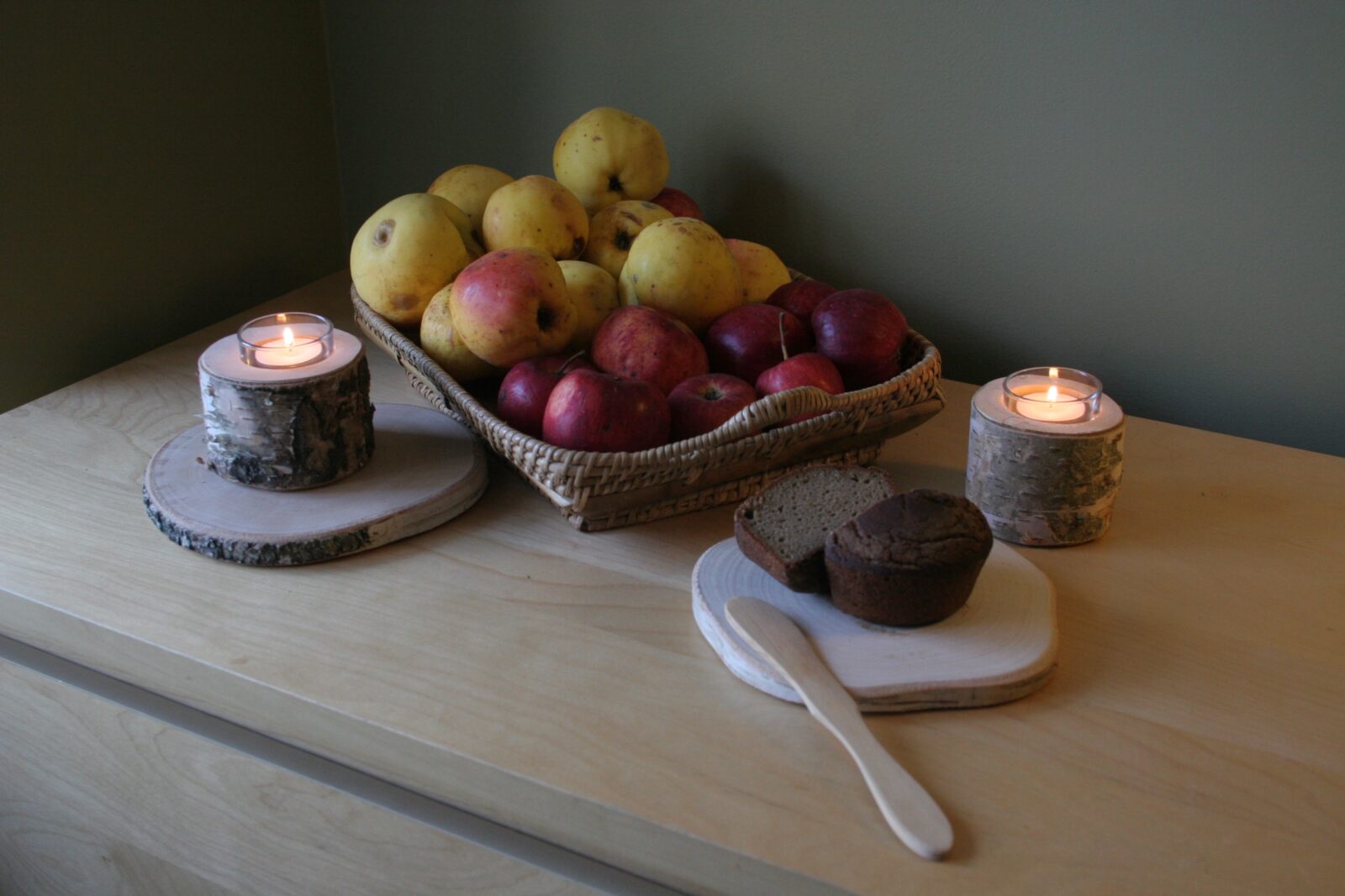 2 koivupuista kynttiläjalkaa kauniissa säkissä. Kynttilät 40mm.