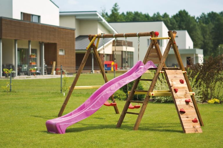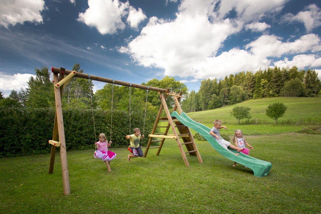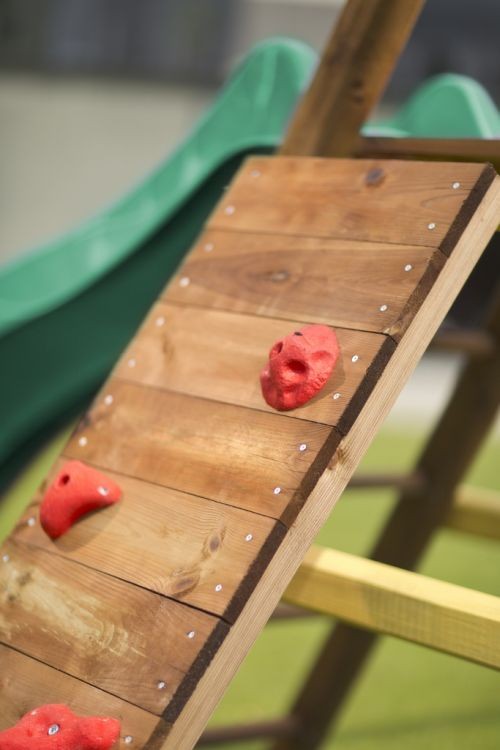 Hintaan sisältyy: painekyllästetyt puuosat, kiinnitystarvikkeet, 2 keinua, kiipeilyseinän kivet ja asennusohje. Kiinnitetään 6 ankkurilla.