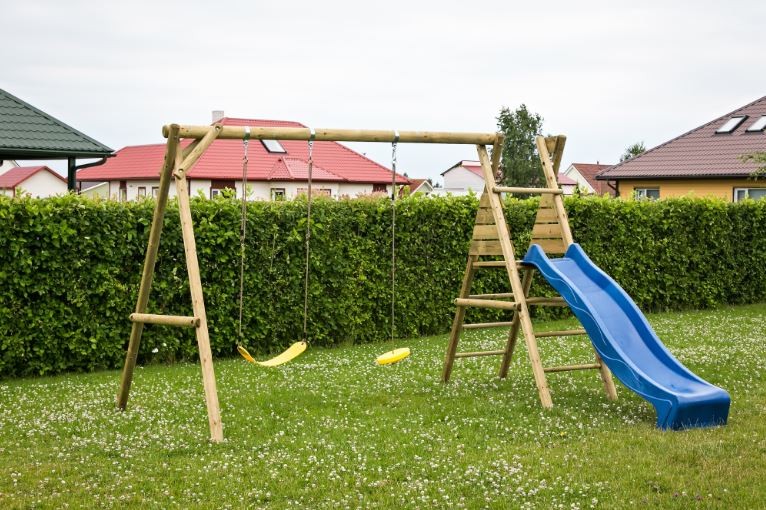 Leikkiteline painekyllästetystä puusta 2 keinulla ja pienemmällä liukumäellä. Liukumäki myydään erikseen. Kiinnitetään ilman ankkureita 35cm syvyydeen. Turvallista 4-lle lapselle.