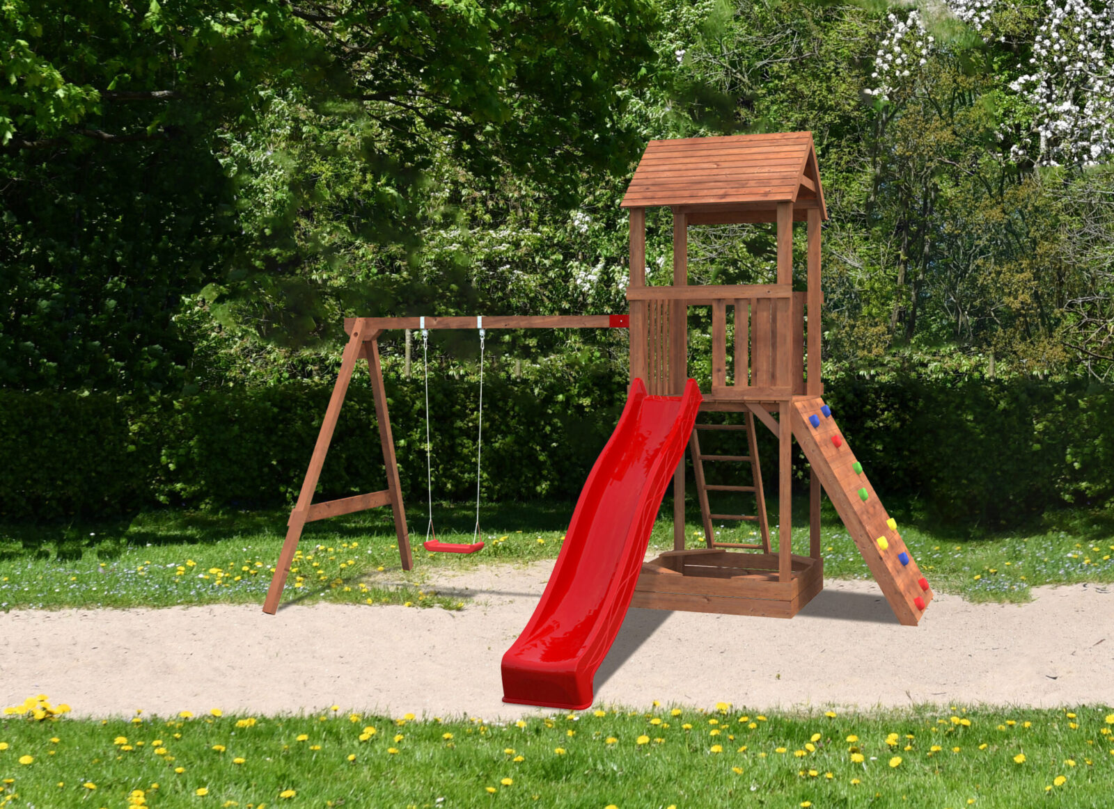 Jesper3 on tukeva leikkikeskus 1 tornilla, keińulla, kiipeilyseinällä ja liukumäellä(lisävaruste).