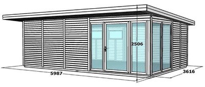 Pinta-ala 21,6m2. Ulkoseinämitat: 599×362 cm, sisäseinämitat:583×346 cm Seinä: 19 mm