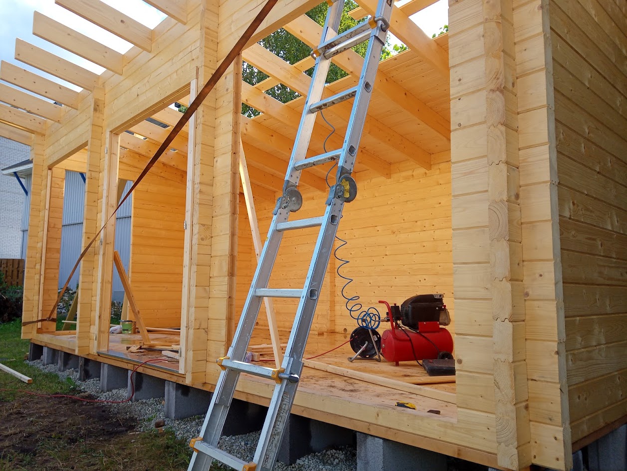 70mm-isestä hirrestä pihatoimiston asennus Haapsalussa 2021 kesällä.