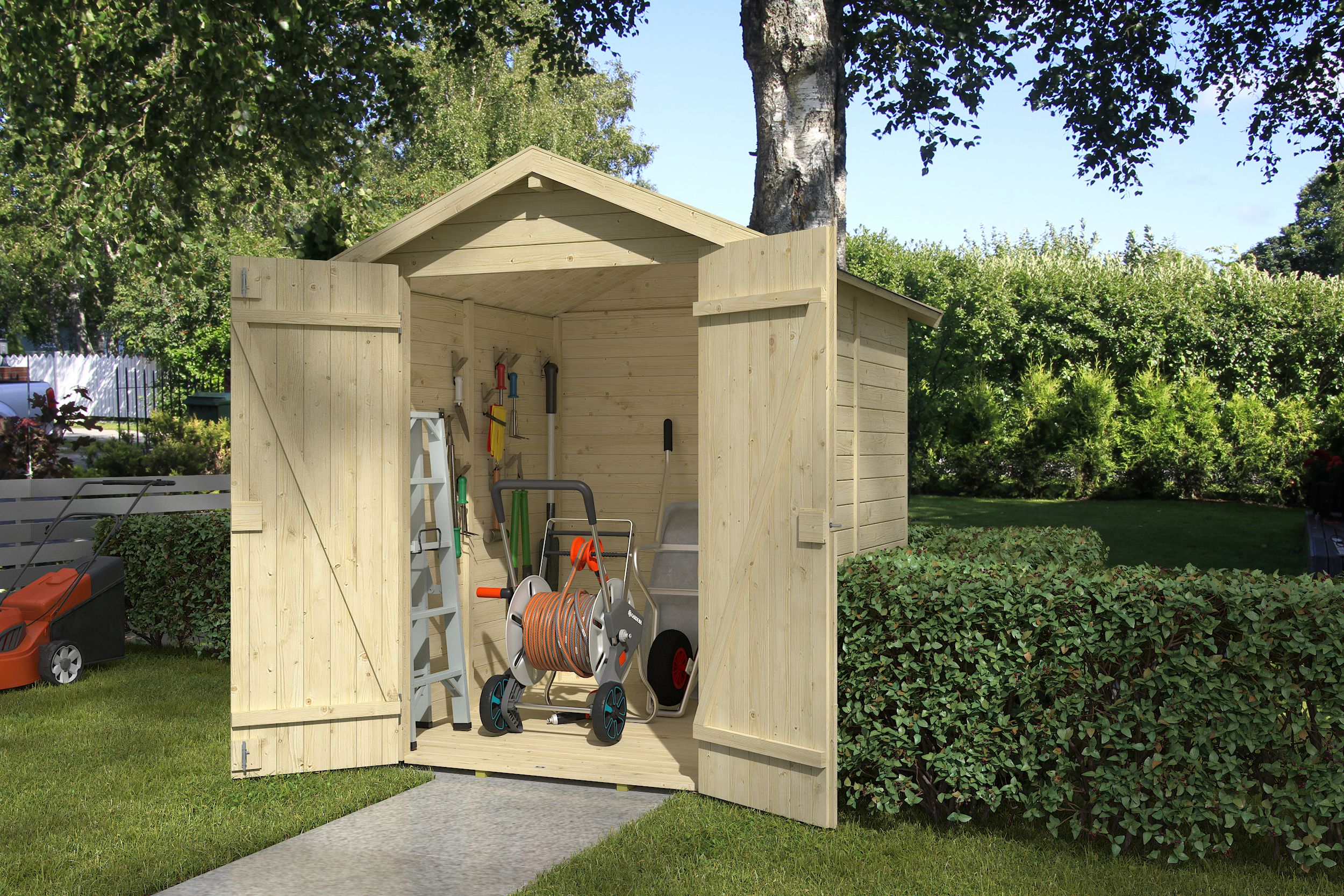 Pulpettikattoinen Kena on pieni pihavaja tärkeimmille pihatarvikkeille.