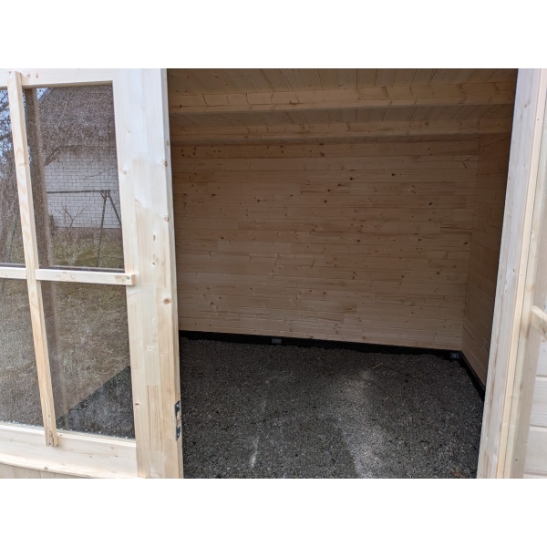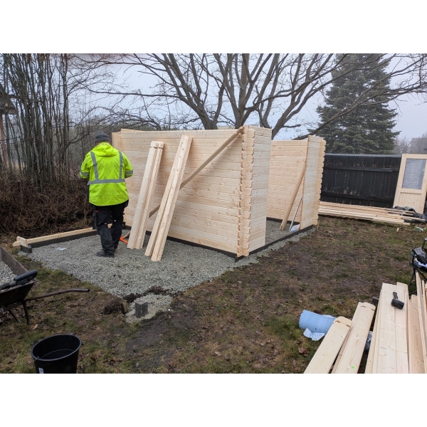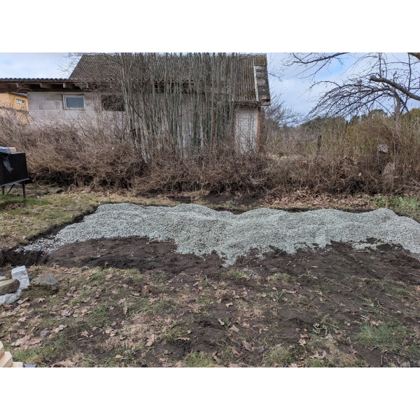 Pohjaksi levitettiin 2,5 t sepelia ja sen päälle laitettiin kierrätysmuovista tehtyt 50 x 95 mm lankut seinien alle.