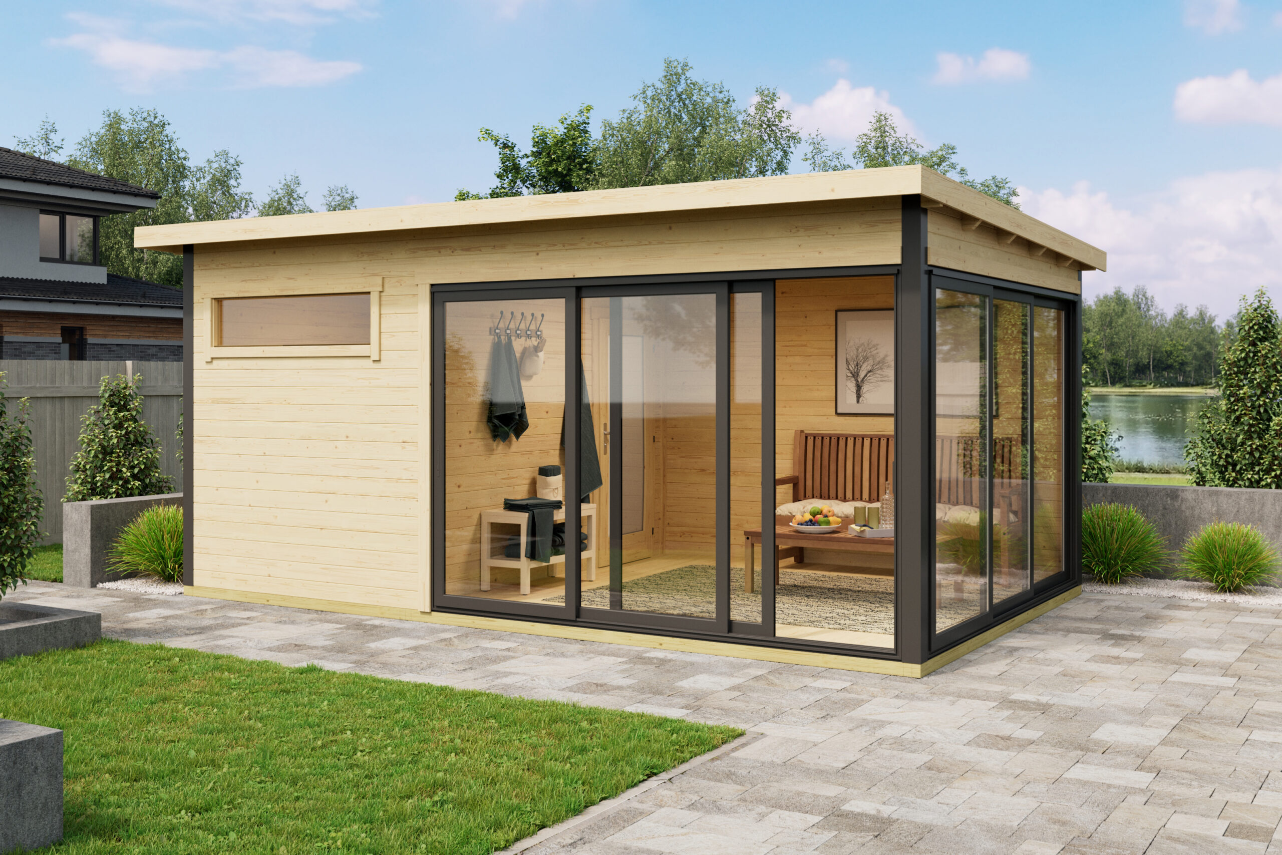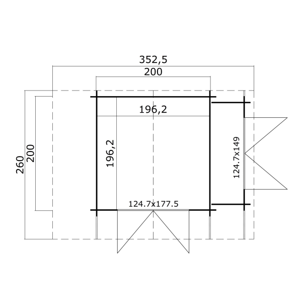 Ulkoseinämitat: 2,0 x 2,0 m + sivukatos ja työkalukaappi . Harjakorkeus 228 cm, räystäskorkeus 194 cm.