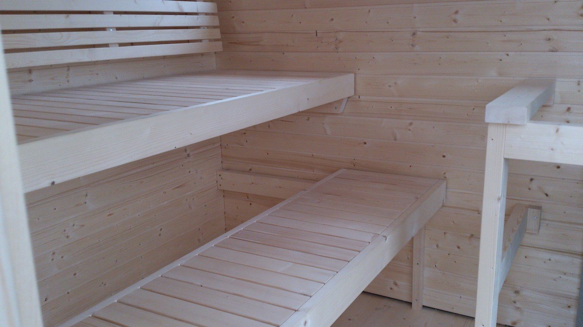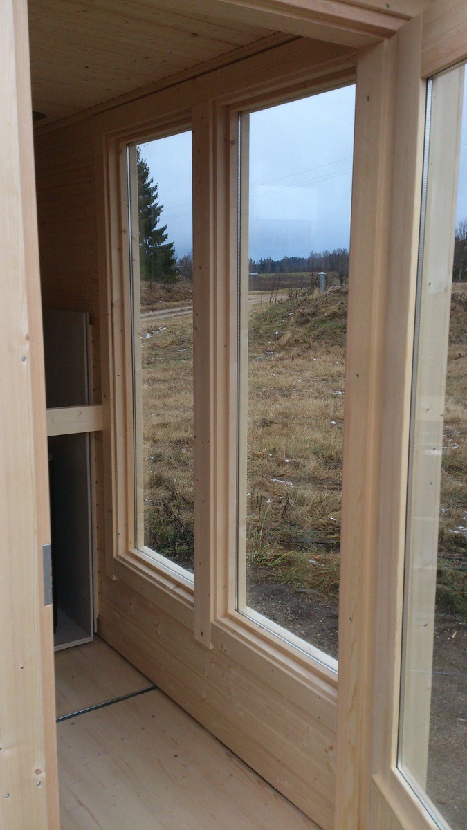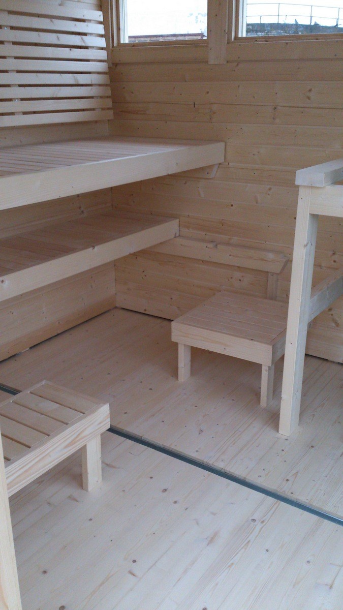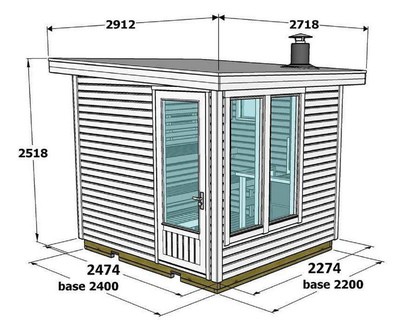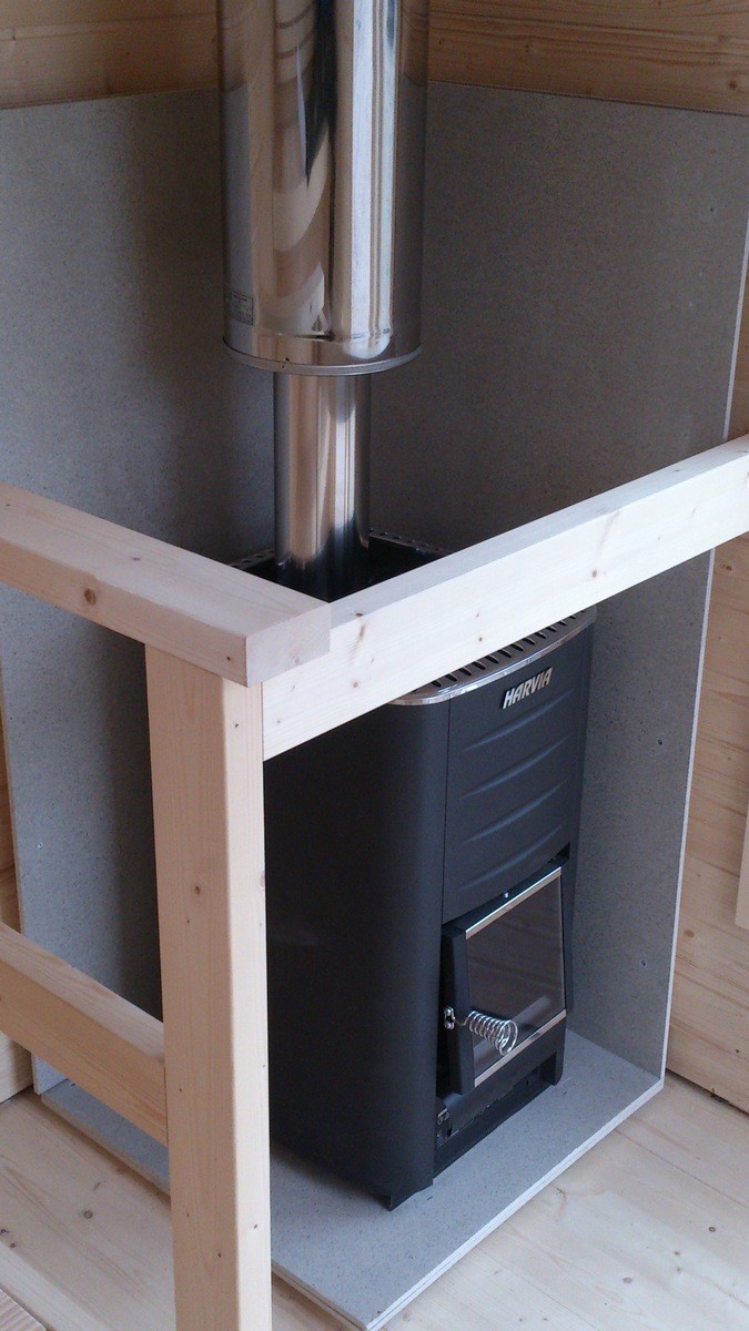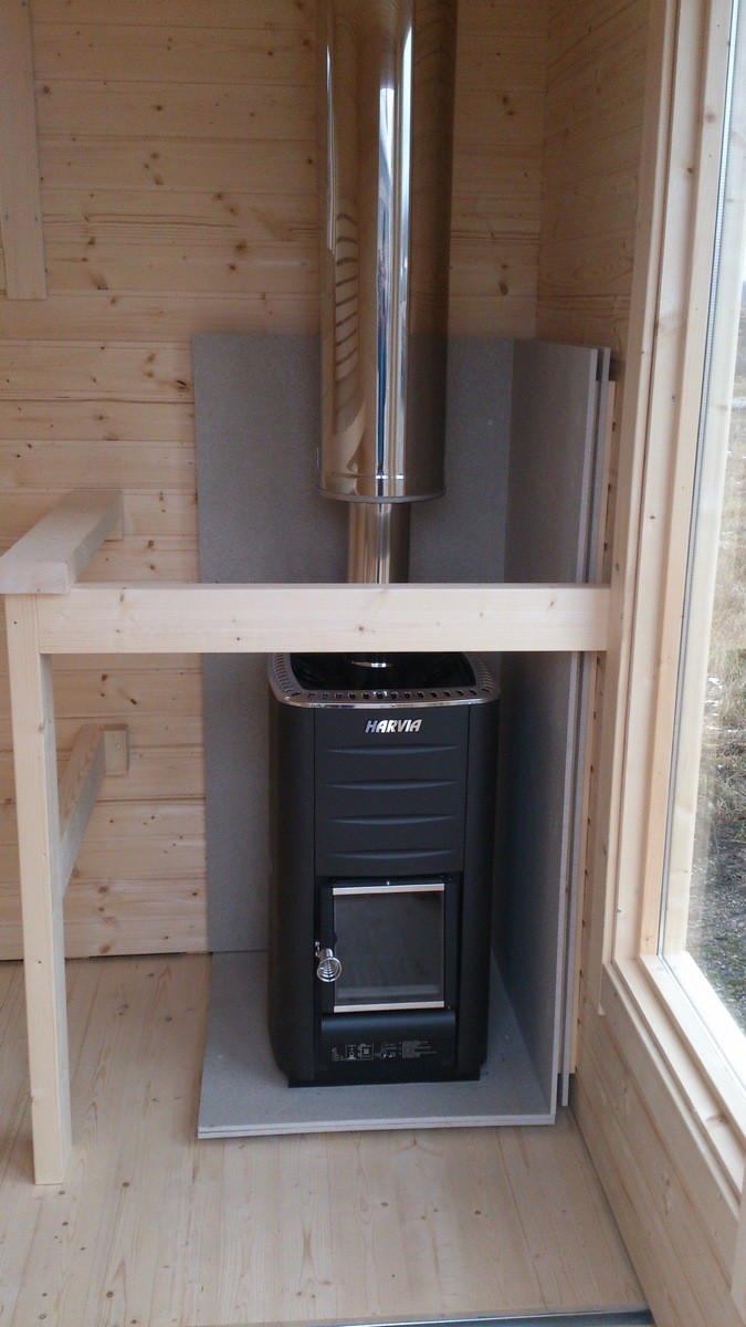 Tehtaalla kasattu käyttövalmis sauna puukiualla Harvia 2.