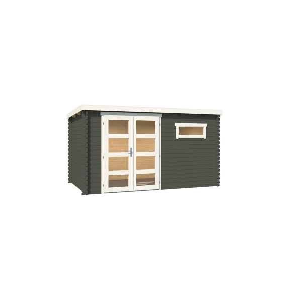 Ulkoseinämitat: 380 x 230 cm. Räystäskorkeudet 217 ja 211 cm.