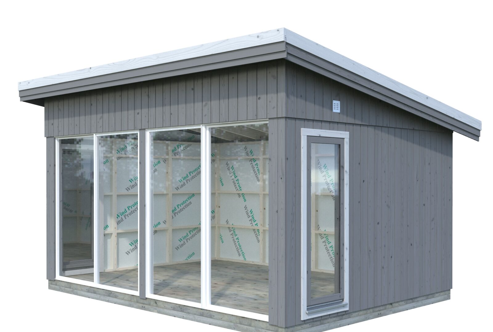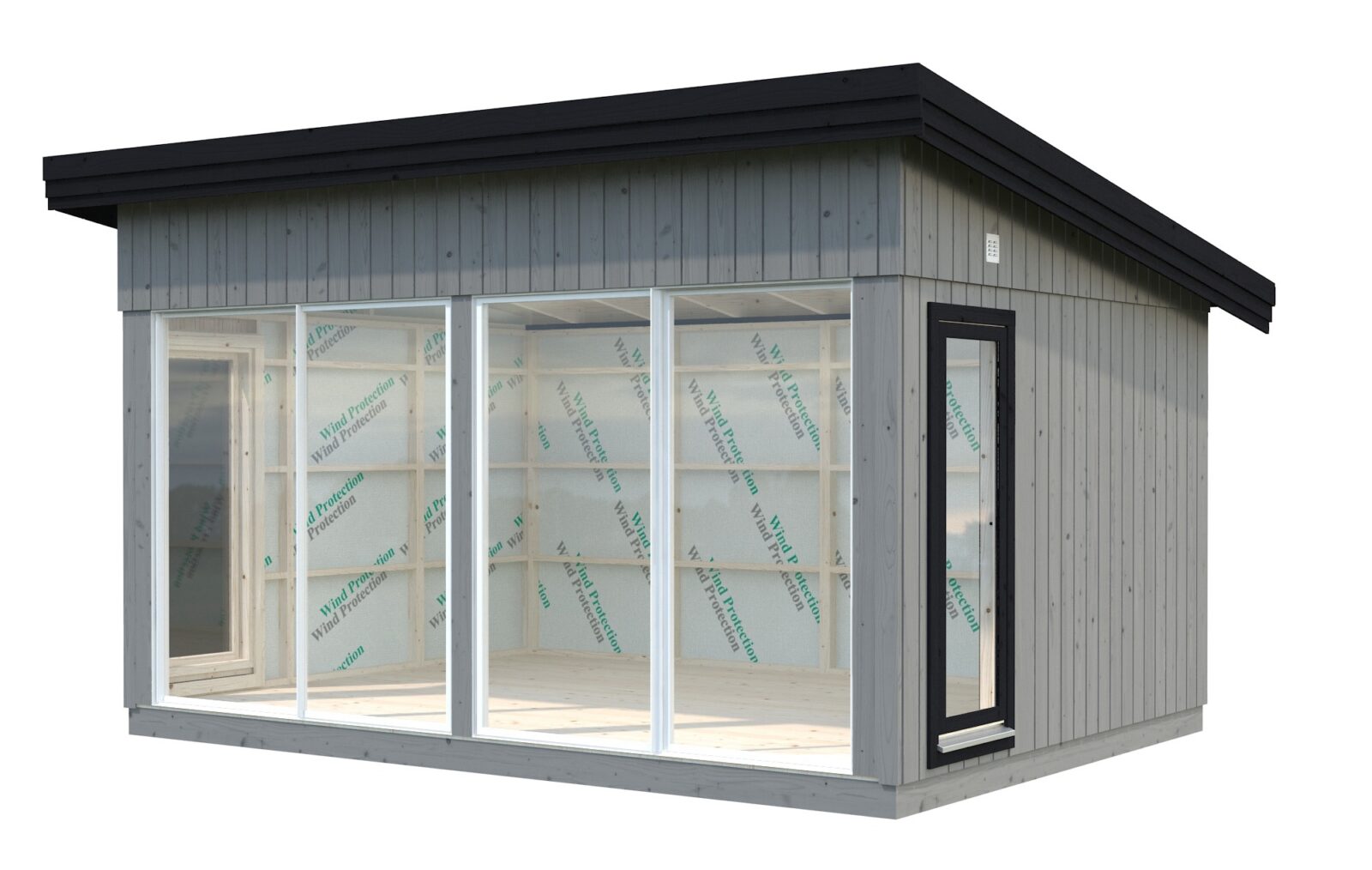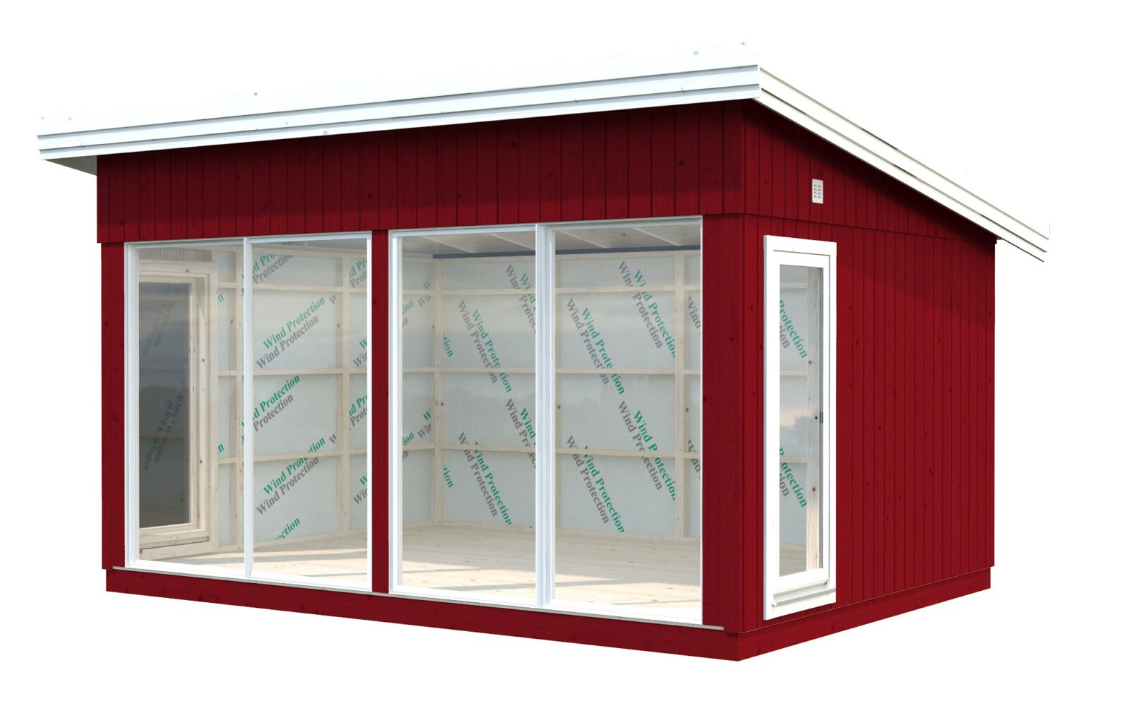 - muovirunkoiset ikkunat 66 x 174 cm 2 kpl ja liukuovet 201 x 203 cm 2 kpl lämpölaseilla(erillinen malli ilman ovia ja ikkunoita Annabel KIT); liukuovien seinäelementtejä ei ole mahdollista asentaa päätyseiniin