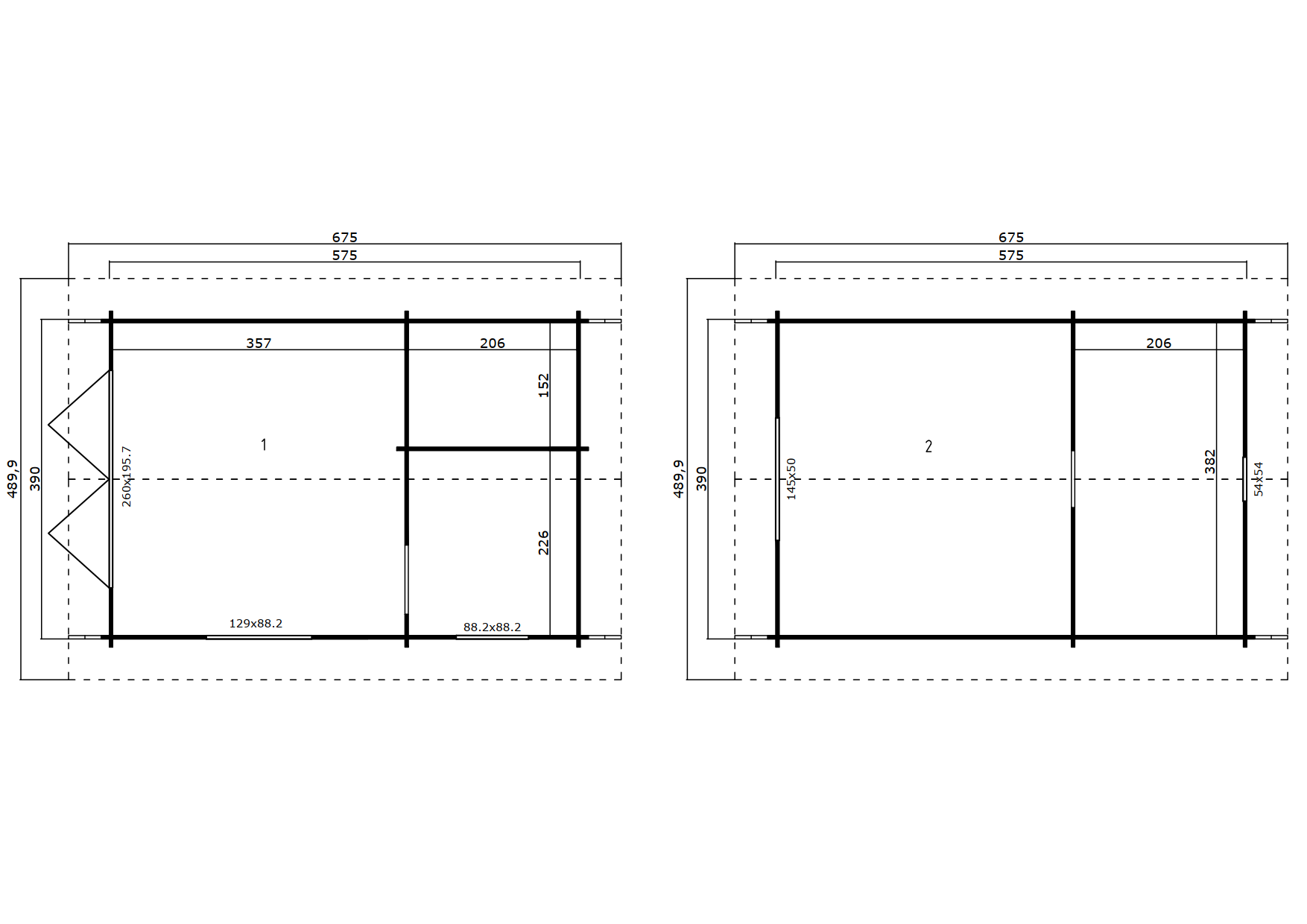 Ulkoseinämitat: 575 x 390 cm. Harjakorkeus 330, seinäkorkeus 240 cm.