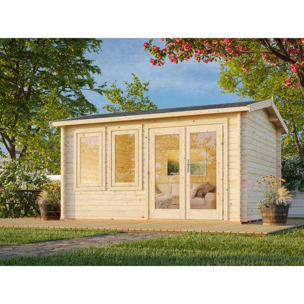 Iiris on valoisa vierasmaja, jota voit käyttää myös askarteluhuoneena. Tässä vierasmajassa on kaksi isoa ikkunaa sekä sylinterilukollinen tuplaovi isolla ikkunalla. Laseihin voidaan laittaa päälle ristikot.