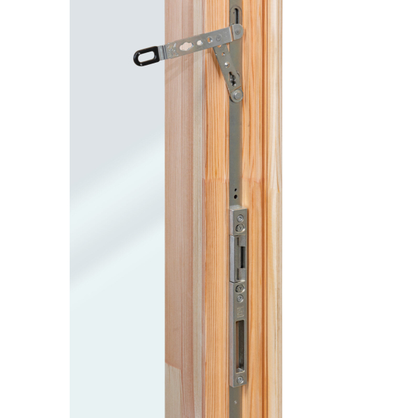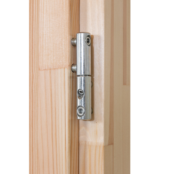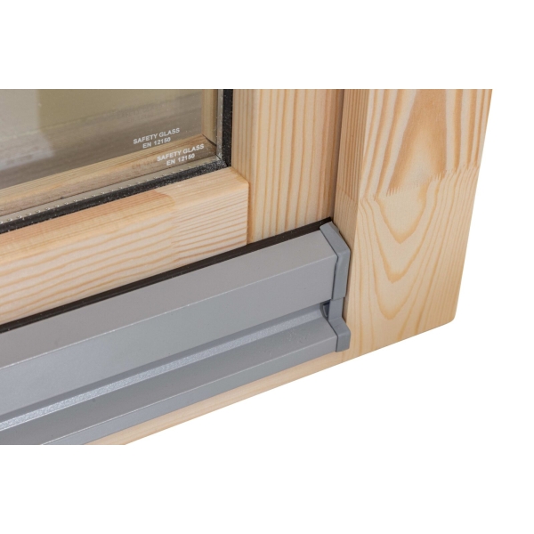 - karmi sormijatkettua massiivipuuta, kynnys metallipäällysteellä, sylinterilukollinen pariovi lämpölasilla 114 x 186 cm(oviaukko sivulaseineen 239 x 196 cm) ja sivuovi 73 x 175 cm