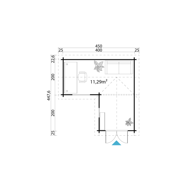 Ulkoseinämitat: 400 x 400 cm. Harjakorkeus 245 cm, räystäskorkeus 211 cm.