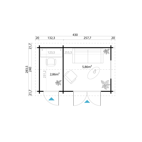 Ulkoseinämitat: 390 x 240 cm. Räystäskorkeus 211 cm, harjakorkeus 251 cm.